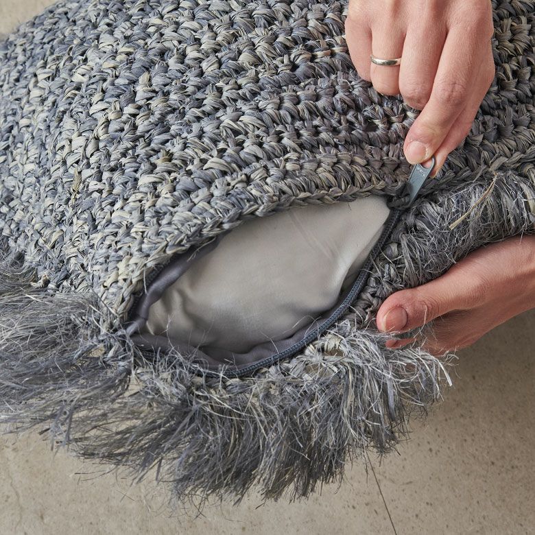天然ラフィアを丁寧に編み上げたクッションカバー。涼しげな素材感でありながら、温かみと自然な雰囲気をお部屋にプラスします。細やかな編み目と繊細なフリンジがアクセントとなり、インドネシアの職人が手作業で仕上げた温かみあふれるハンドメイドアイテムです。上質な素材感と洗練されたデザインが、ワンランク上の高級感と上品さを演出します。