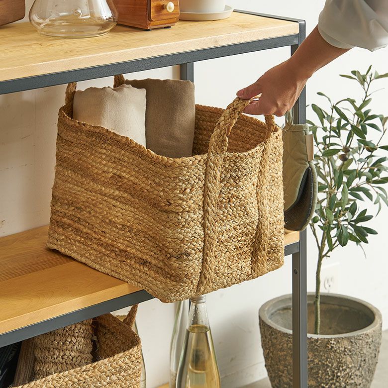 注目の天然素材ジュート100%使用、ナチュラルな風合いが魅力のバスケット。