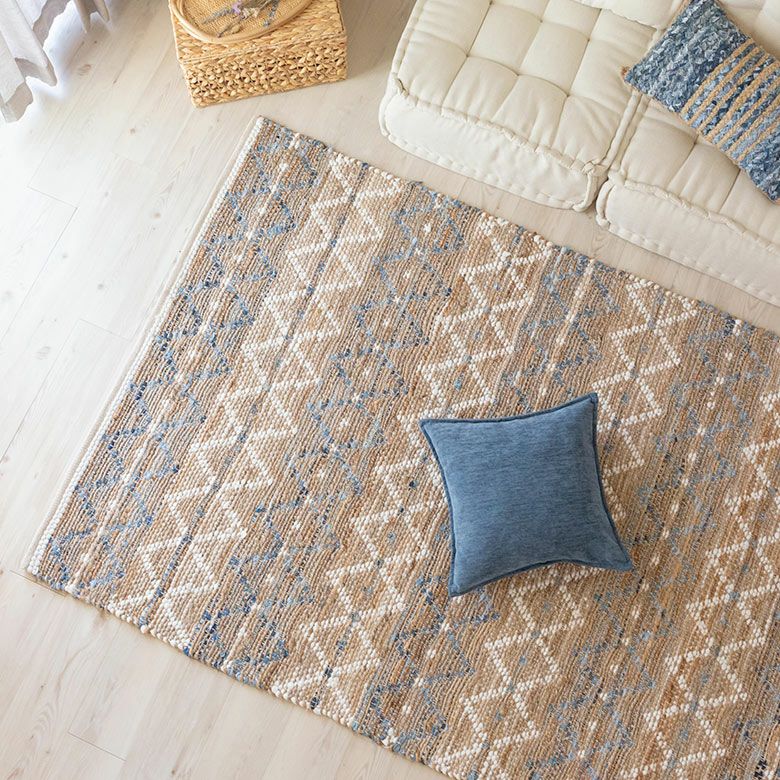 手織り リビング インド BOHO ボーホー 絨毯 敷物 マット ラグ ラグマット 約 130×190 cm 長方形 ジュート 麻 コットン 綿 ナチュラル ブルー アイボリー [34445-bl]【 raha ラーハ デザイン カーペット 天然素材 ハンドメイド おしゃれ 北欧 オールシーズン 春 夏 秋 冬 リゾート コースタル 幾何学模様 アジアン エスニック 】
