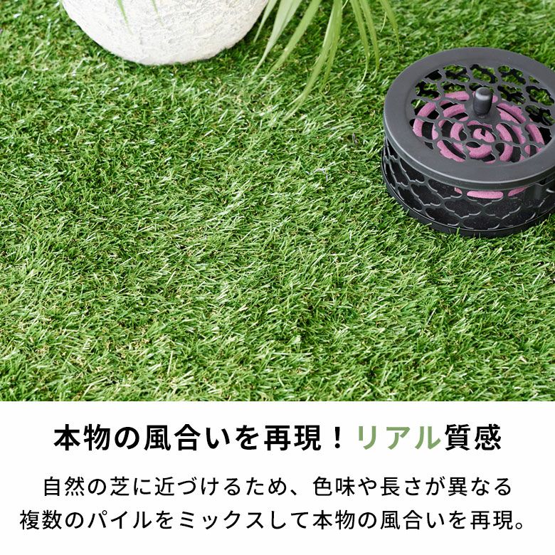自然の芝に近づけるため、色味や長さが異なる複数のパイルをミックスして