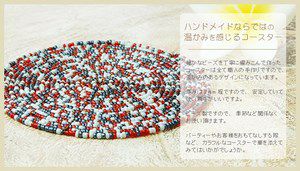 | 青、赤、白のトリコロール色を使ったハンドメイドのコースター。色合いがとっても可愛いですね。これもバリの職人が丁寧にビーズを編みこんで作ったハンドメイドなんです。とっても丁寧な仕上がりで、ハンドメイドの温かみも感じられます。 アジアンな食器にはもちろん、ポップな色の食器やシンプルな白い食器にもマッチしてくれる万能なカラーです。毎日のティータイムを楽しく華やかに色を添えてくれます。パーティーなどに使ってもより気分も楽しくなりそうですね♪ |