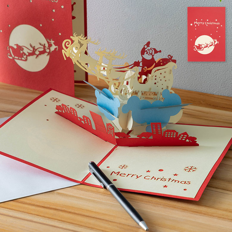 白い封筒付きで、家族や友人、取引先への贈り物にもぴったり。「贈る」だけでなく、「飾る」楽しみもある、心に残るクリスマスカード。大切な人へのプレゼントを、より印象的に演出してくれます。