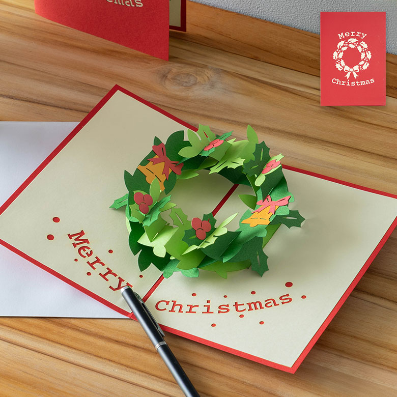 ・クリスマスリースが飛び出す、開いて楽しい立体ポップアップのクリスマスカード