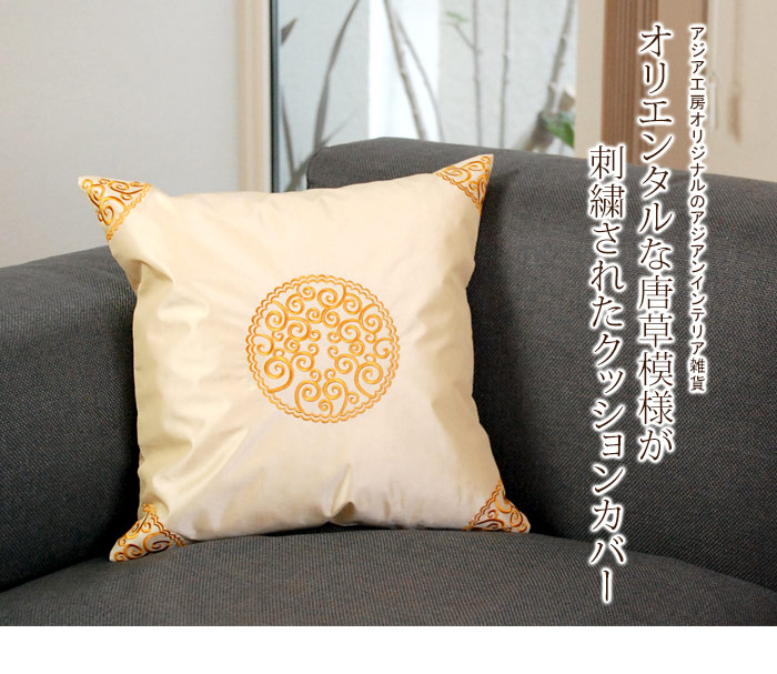唐草模様が刺繍されたクッションカバー。さらっとした質感と、それをより引き立てる丸いオリエンタルな模様が中央と四隅に彩られています。