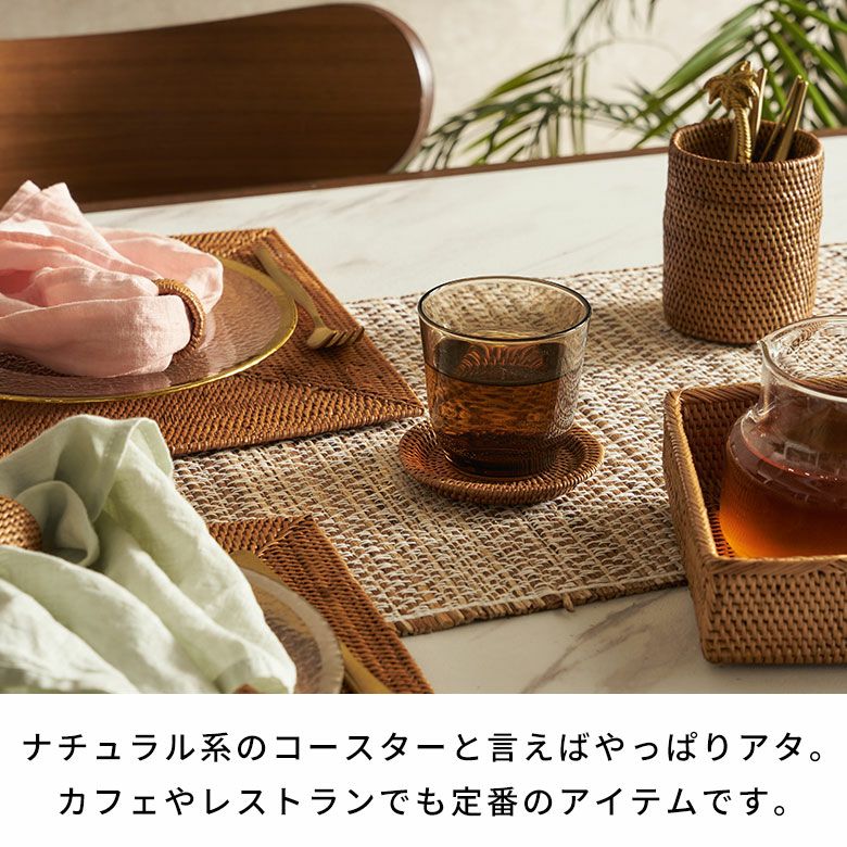 インドネシアで作られたアタのコースター。ラウンド型は曲線のフォルムはやわらかい印象を与え、丸い形がグラスやカップに自然にフィットし、日常的に使いやすい形状。フチありでコースター周囲に高さがあるため、存在感が出てテーブルがぐっと華やかに。グラスから垂れた水滴を受け止め、外へ流れにくいのでテーブルを濡らしにくく、グラスやカップが滑りにくいため安定感があります。