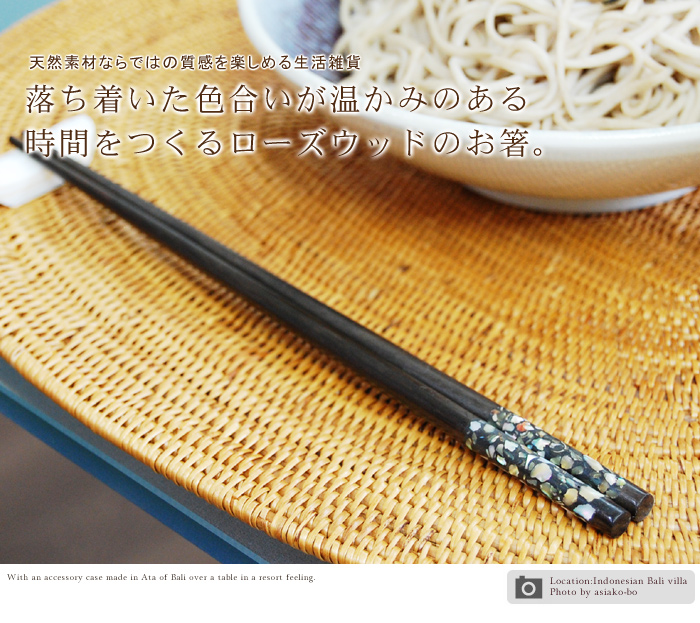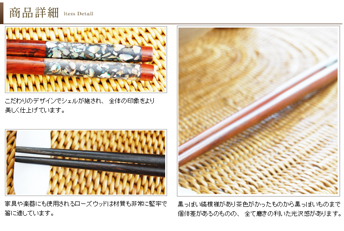 こちらのアイテムは家具や楽器にも使用される堅牢な素材で、光沢ある質感に磨き上げられたローズウッドで作られたお箸です。