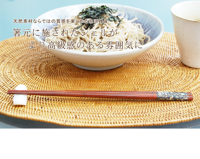 大小さまざまに散りばめられることによって角度ごとに色に変えて輝く箸元(箸頭)に施されたこだわりデザインのシェルが華やかさをプラス。