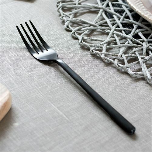 珍しいオールブラックのカトラリーは、平たいハンドルもスマートでクールな印象。