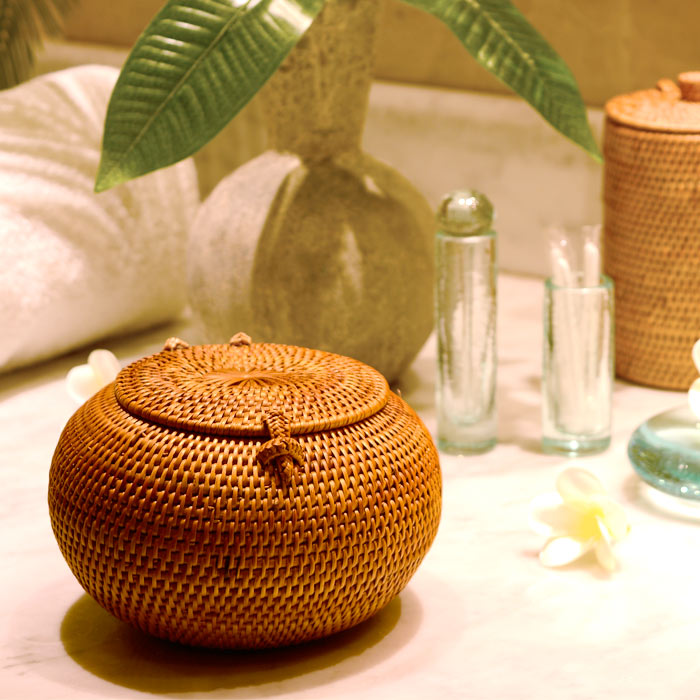 丸い形のフタ付き小物入れケース バリ島トゥガナン村の職人さんがひとつずつ丁寧に編んで作ったアタのフタ付き小物入れ。 |