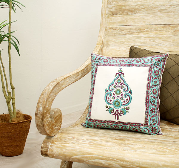 イスラム柄のオリエンタルなプリントのクッションカバーは、コットン100%のホワイト