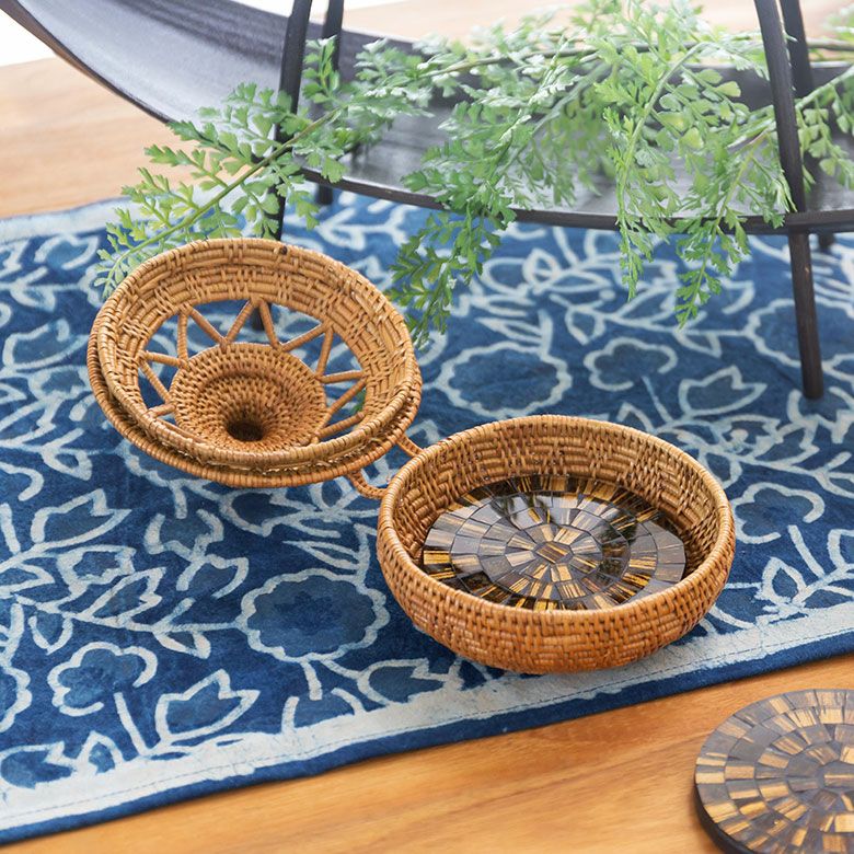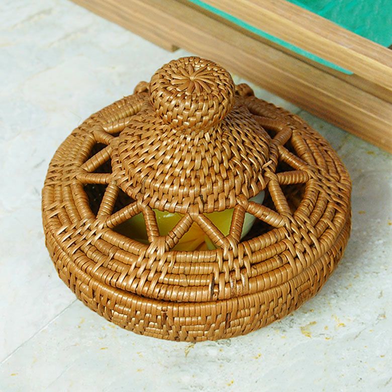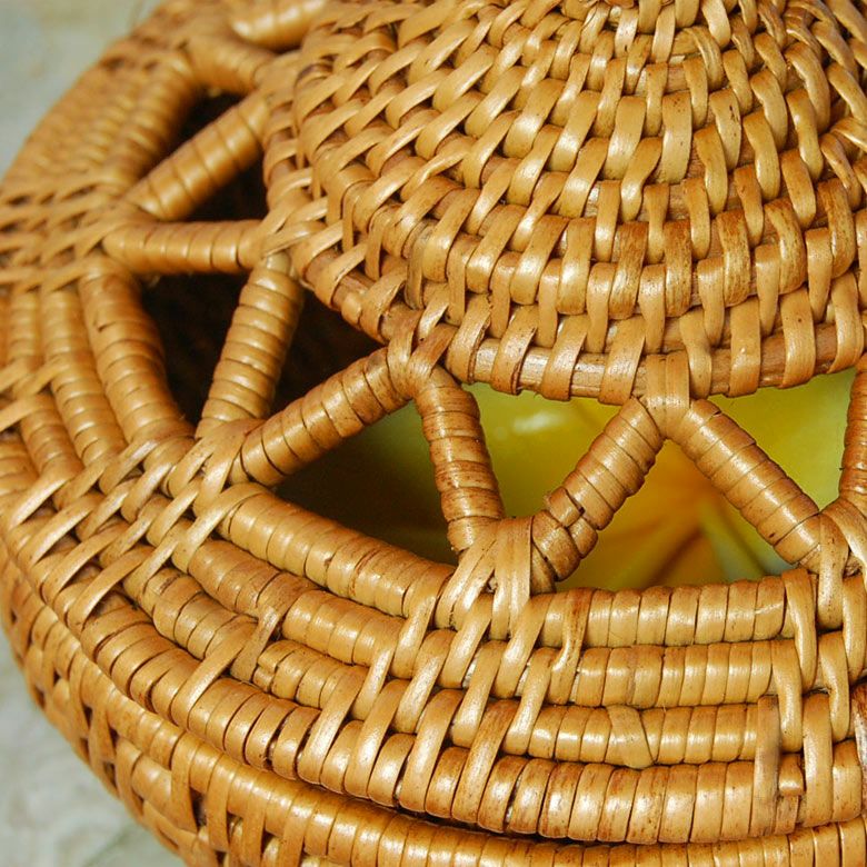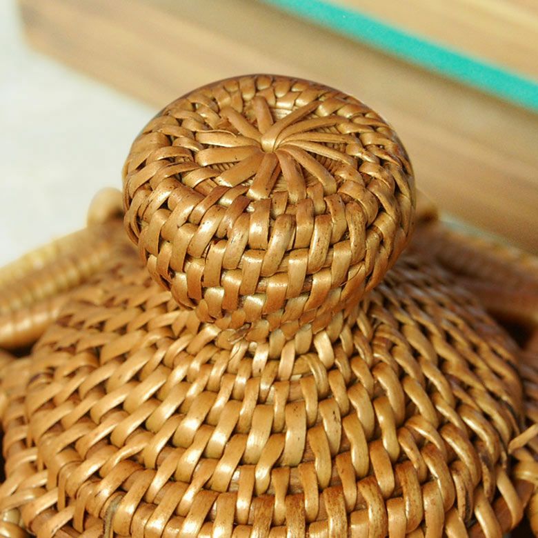 天然素材アタで編まれたマジックポット型の小物入れ。