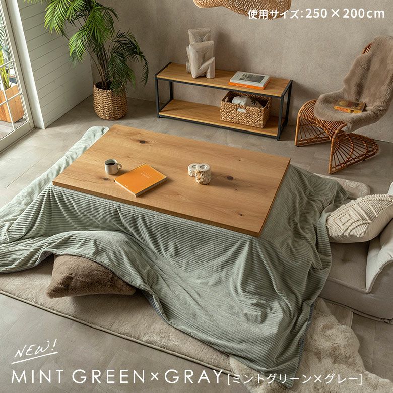 落ち着きのあるカラー展開のこたつ布団は、観葉植物や天然素材のバリ雑貨ともマッチ。