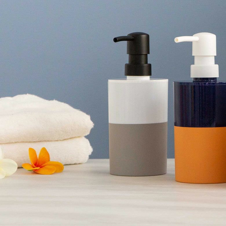 陶器の質感にバイカラーが映えるバスアイテムシリーズ。