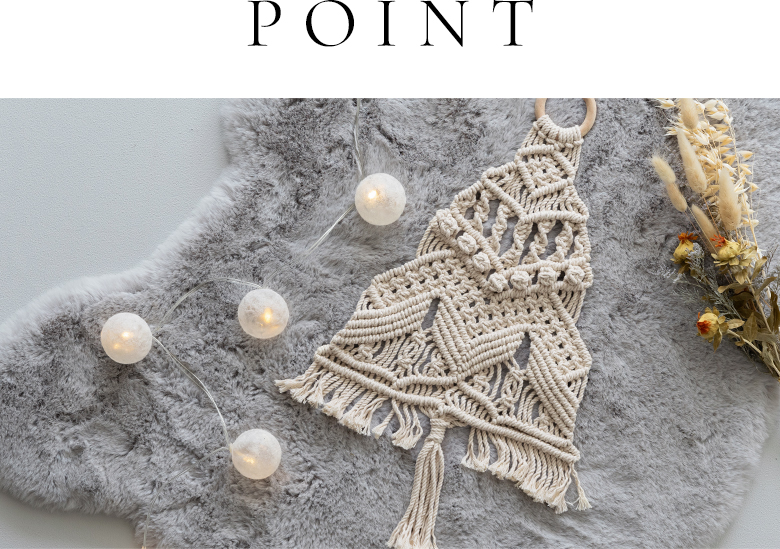 「マクラメ編み」とは、手で紐を結んだり編んだりという工程を繰り返し、模様を生み出す技法。