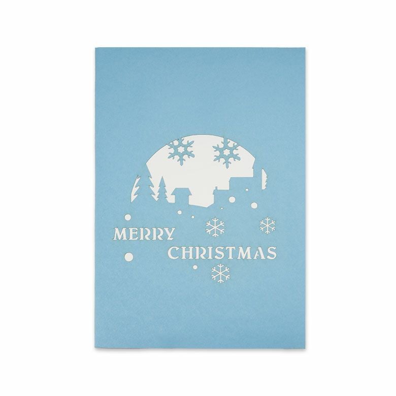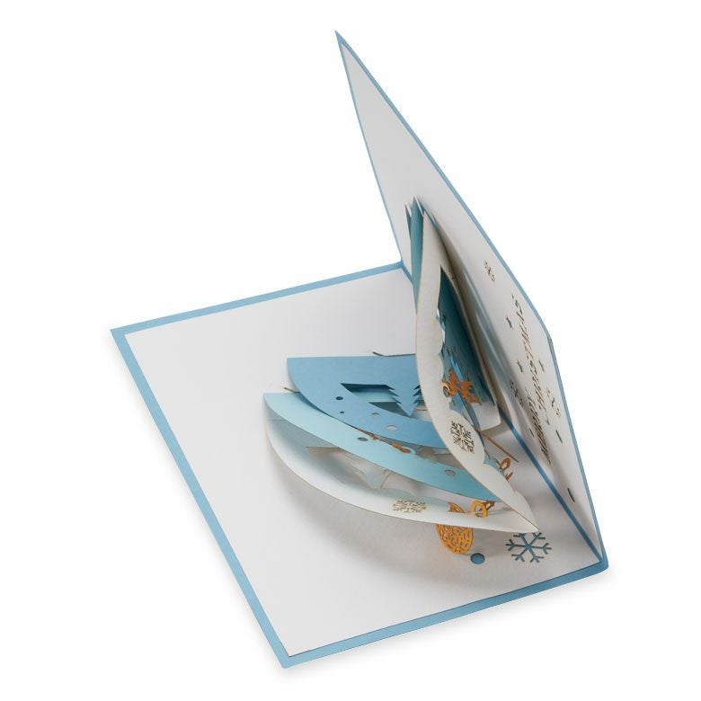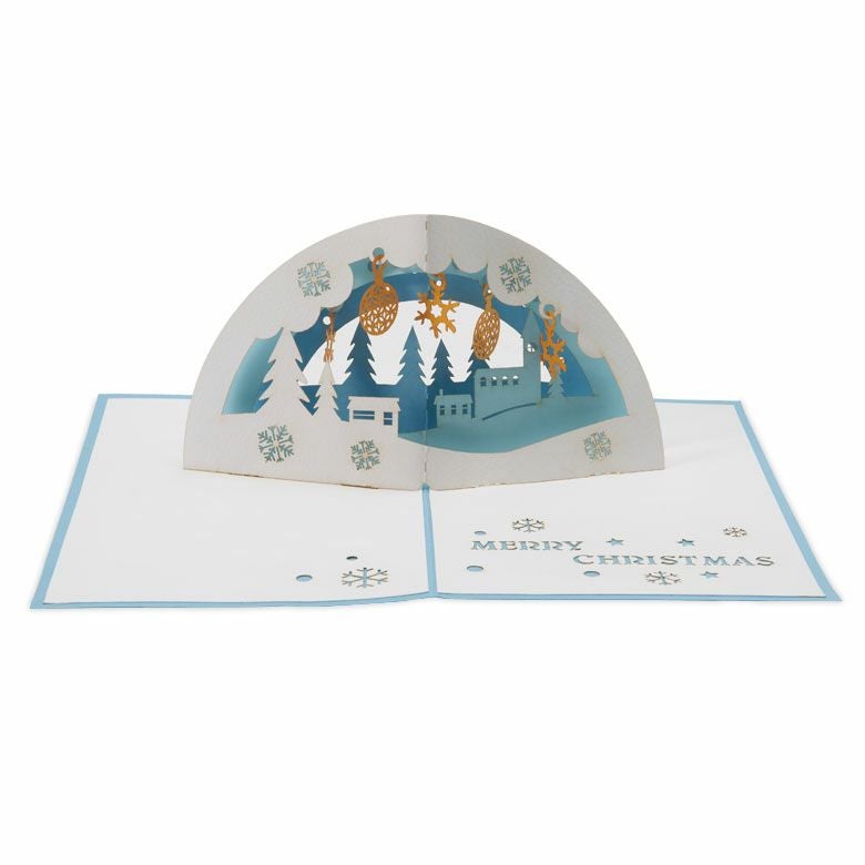 ・雪降る街並みとゴールドのオーナメントが飛び出す、開いて楽しい立体ポップアップのクリスマスカード