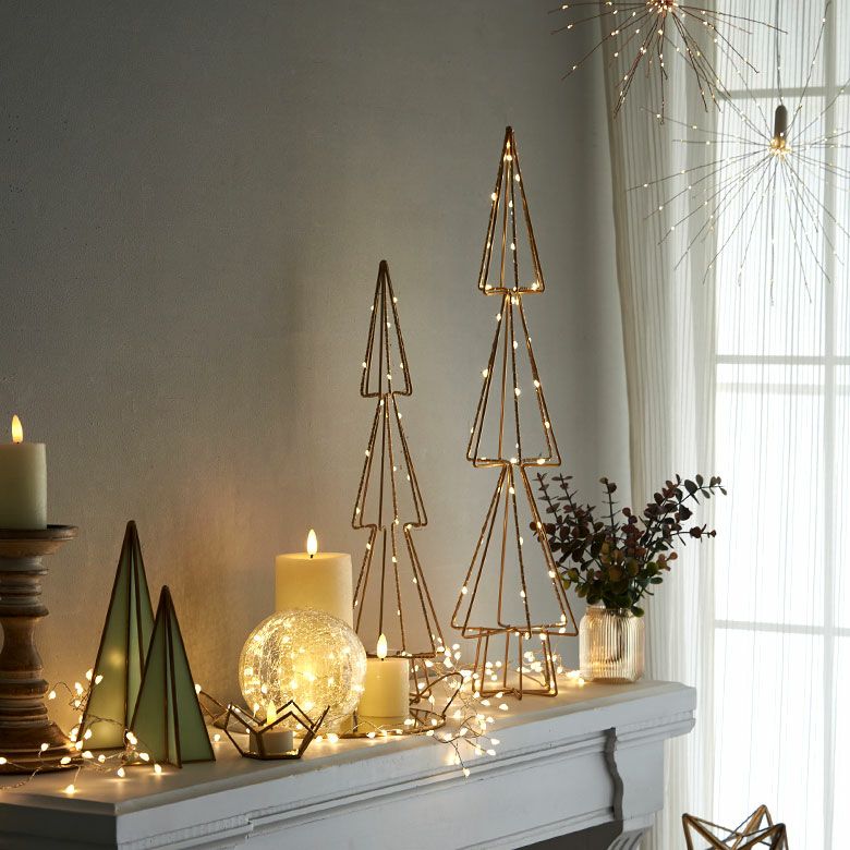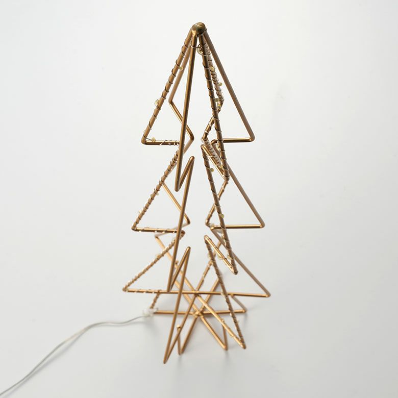 ゴールドのフレームにストリングライトを飾り付けた、ツリーのデコレーション。