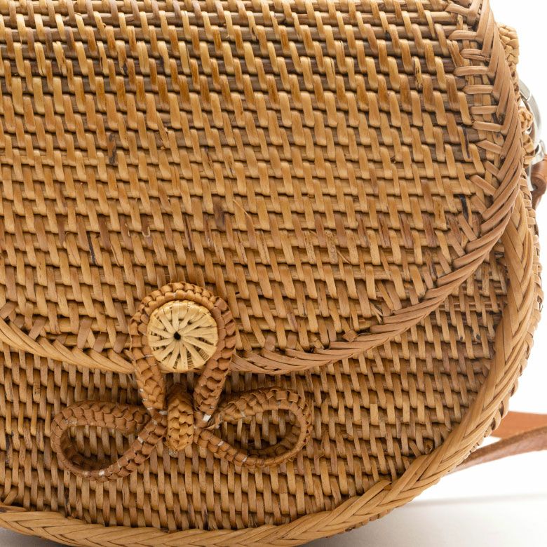 天然素材アタで編まれたハンドバッグは、独特の色合いと細かい編み目が特徴。