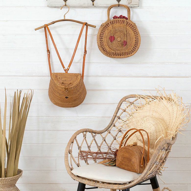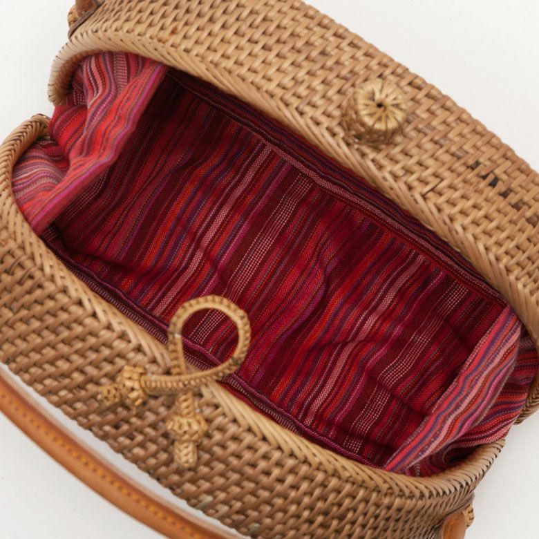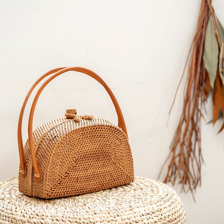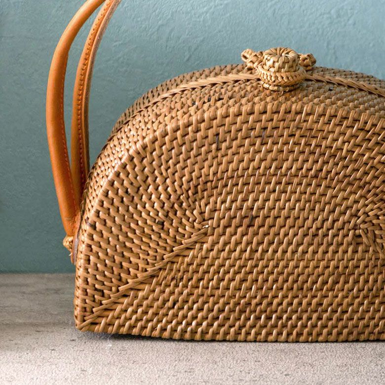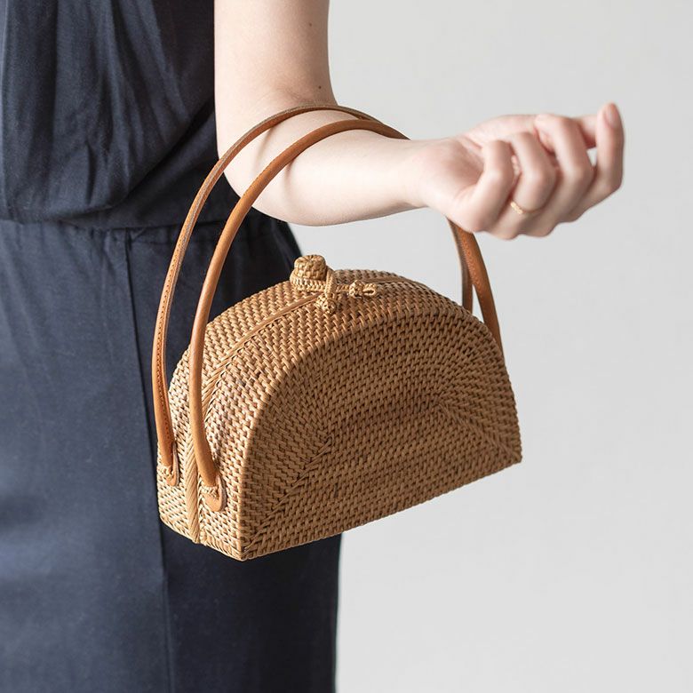 天然素材アタで編まれたハンドバッグは、独特の色合いと細かい編み目が特徴。