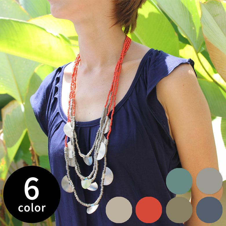 シルバーのメタルプレートがきらりと光る、ビーズで出来たアジアンネックレス。