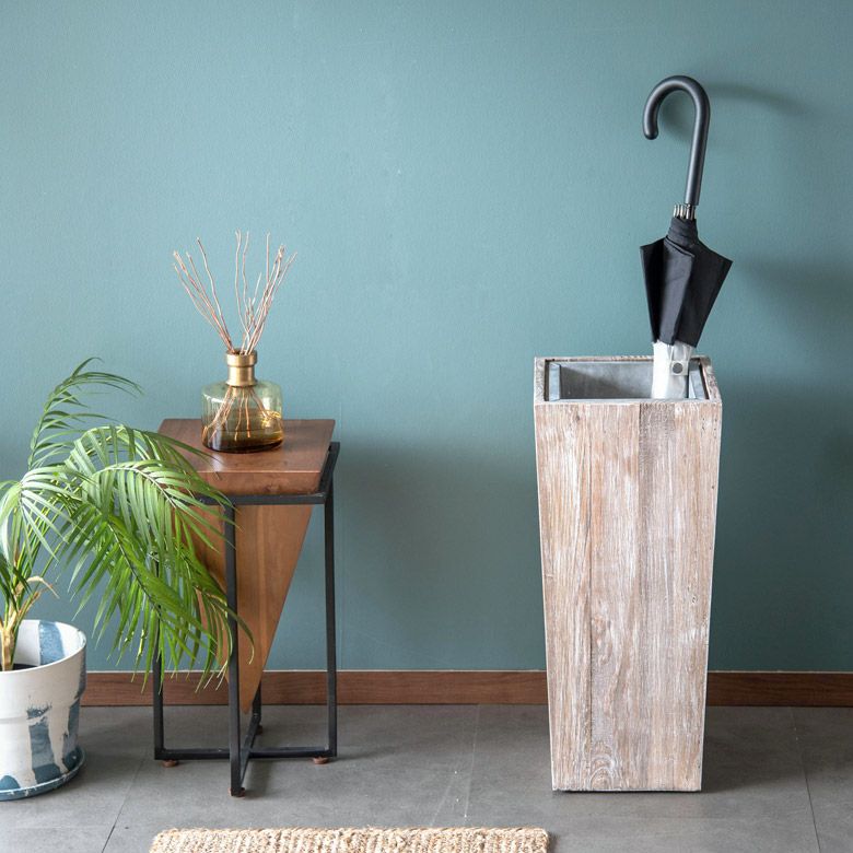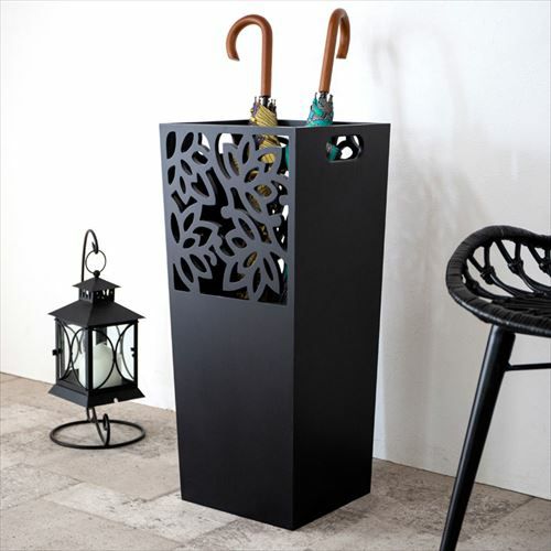 玄関先でオブジェのような存在感を放つユニークなデザインの傘立てを