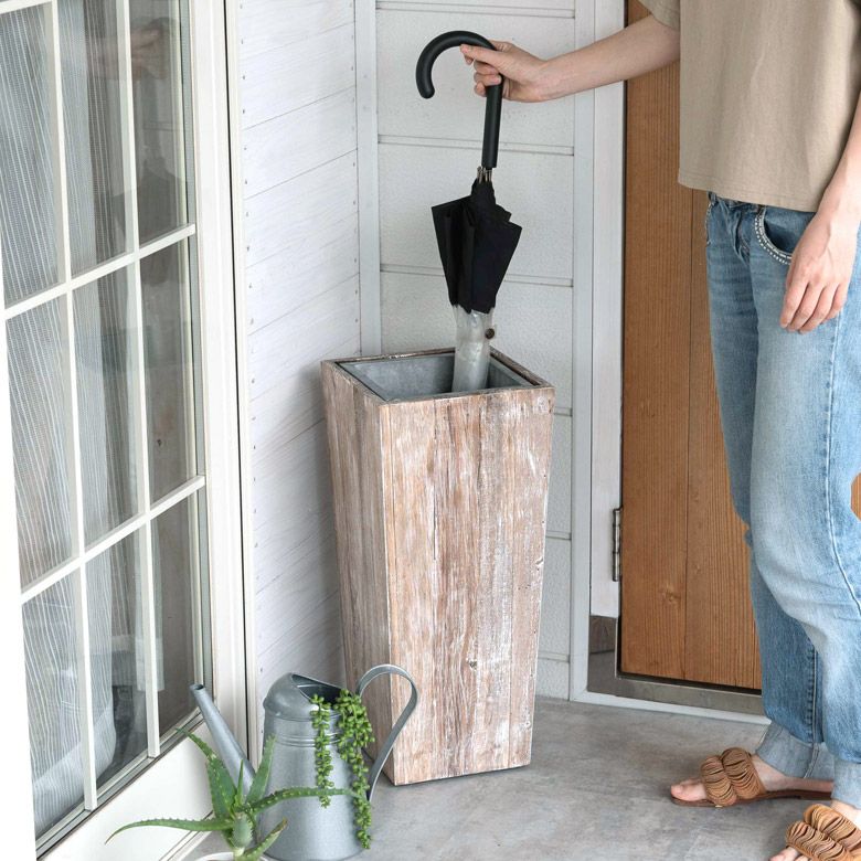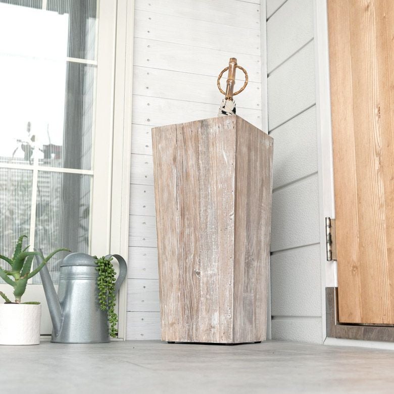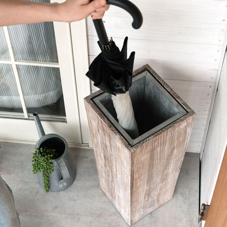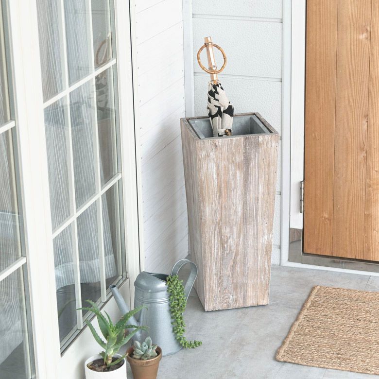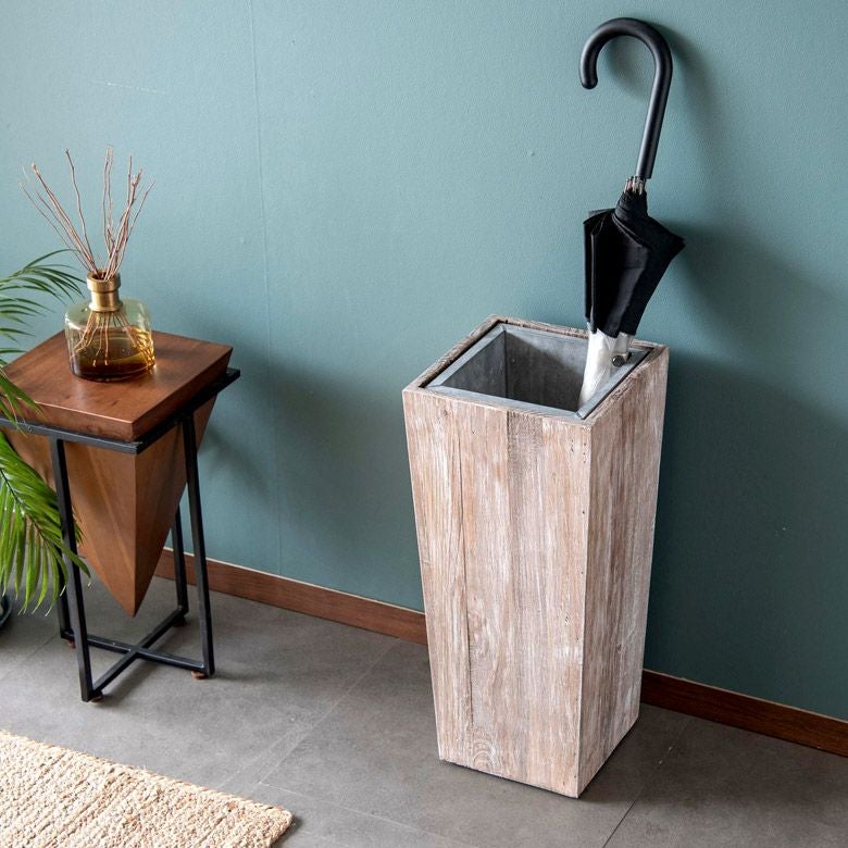 アップサイクルされたパイン材から作られた、存在感抜群の傘立て。