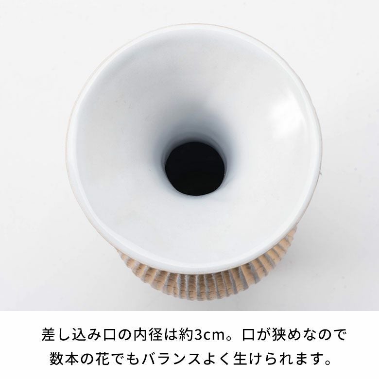 口が狭めなので少ない植物でもスタイルよくおさまり、花を生けるのも簡単。リビング・玄関・ダイニング・寝室など、さまざまな空間に自然と溶け込み、花を入れずにそのままオブジェとして飾っても、インテリアにさりげない上品さをプラスしてくれます。