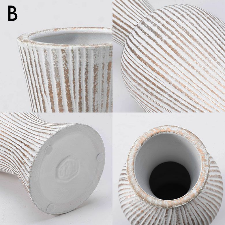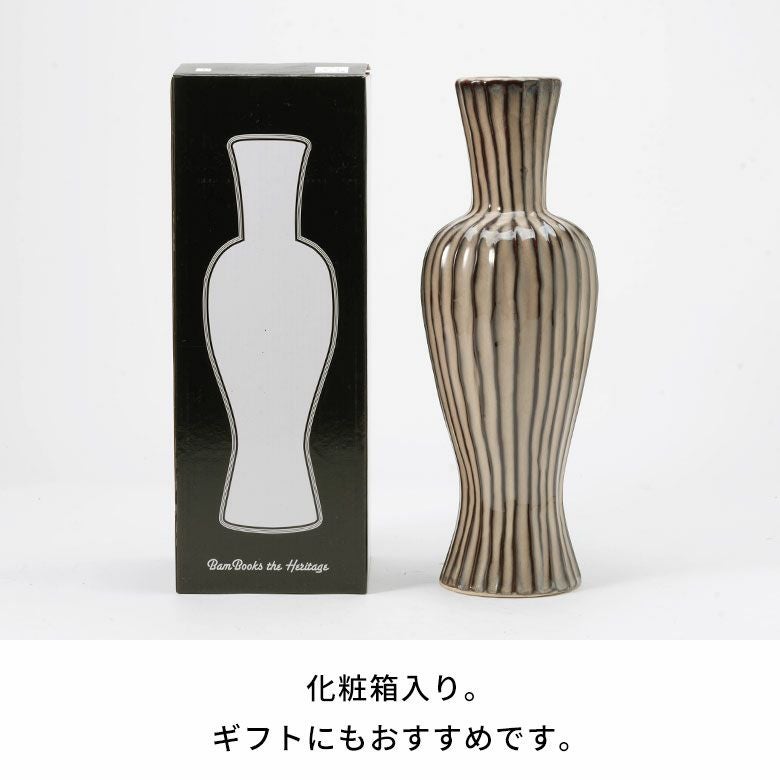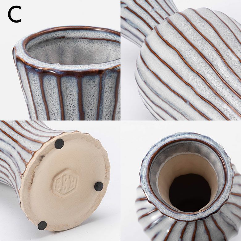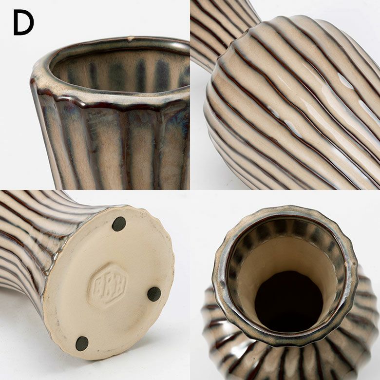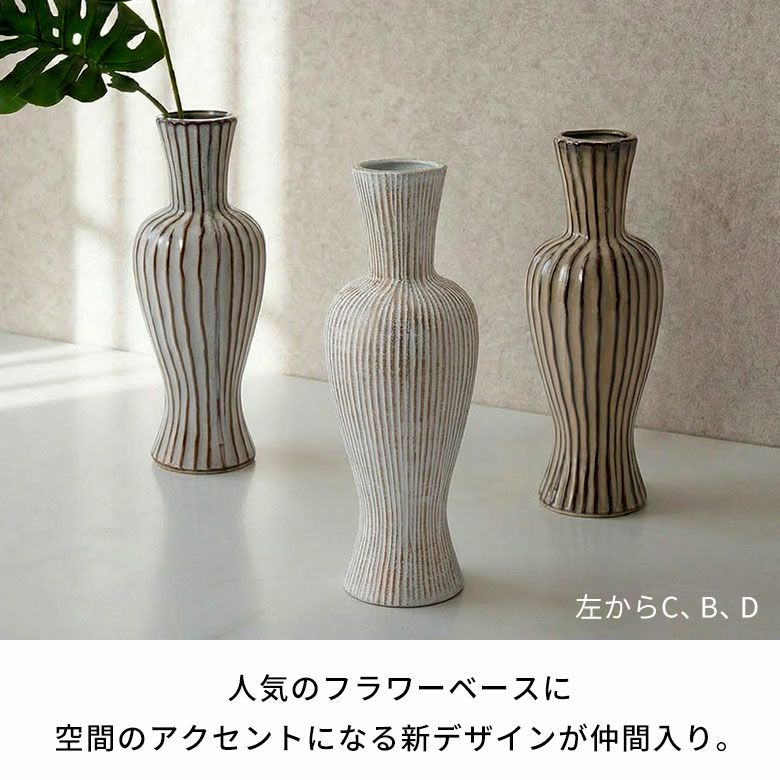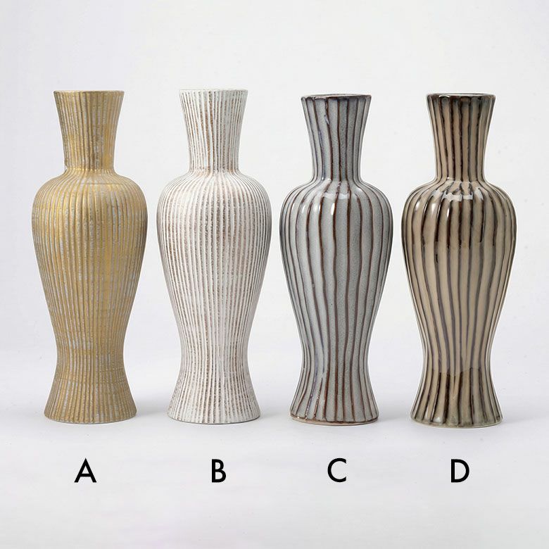 上品なシルエットのセラミック製フラワーベース。縦に流れるリブ模様や、釉薬の重なりの表情などが楽しめる全4柄展開。高さ38cmの大きめサイズで存在感があり、シンプルなシルエットでありながら個性のある佇まいです。ドライフラワーや造花を飾るのはもちろん、水入れ可能なので生花のある暮らしも楽しめます。