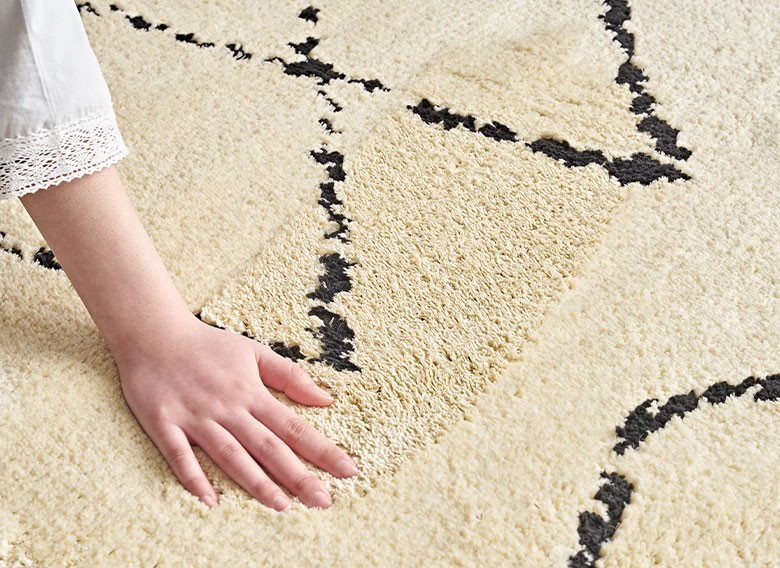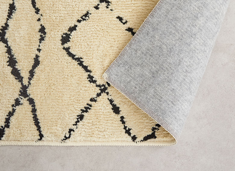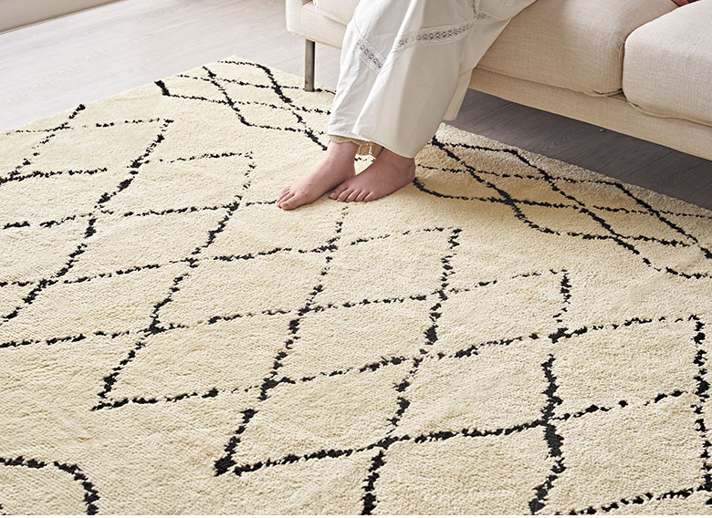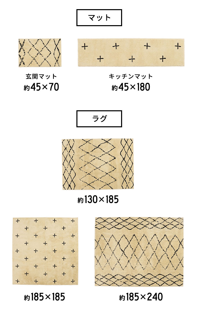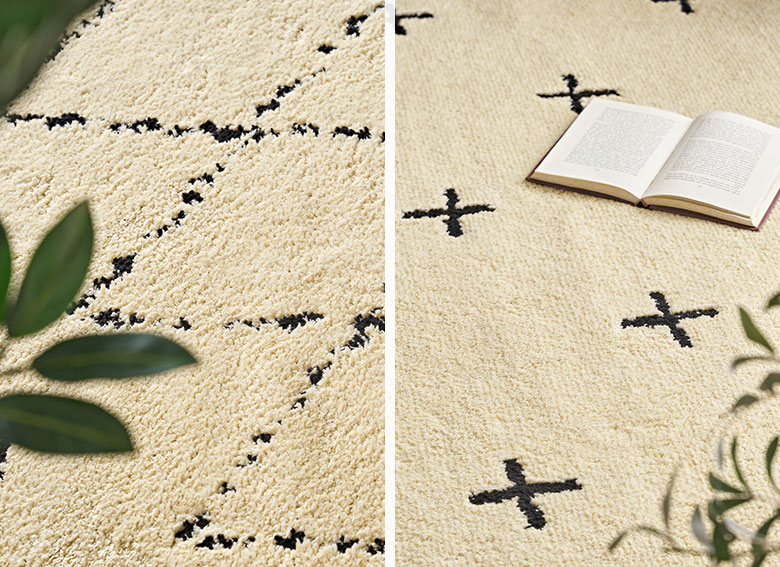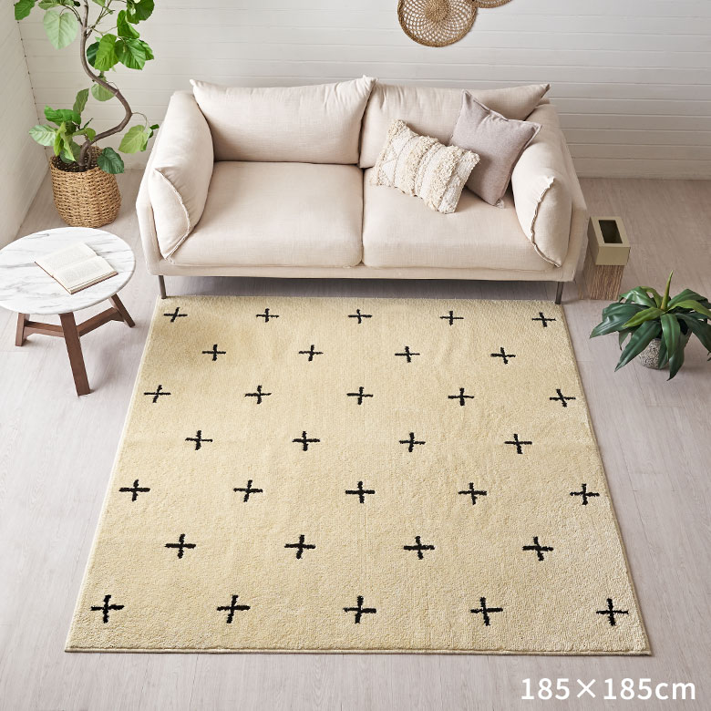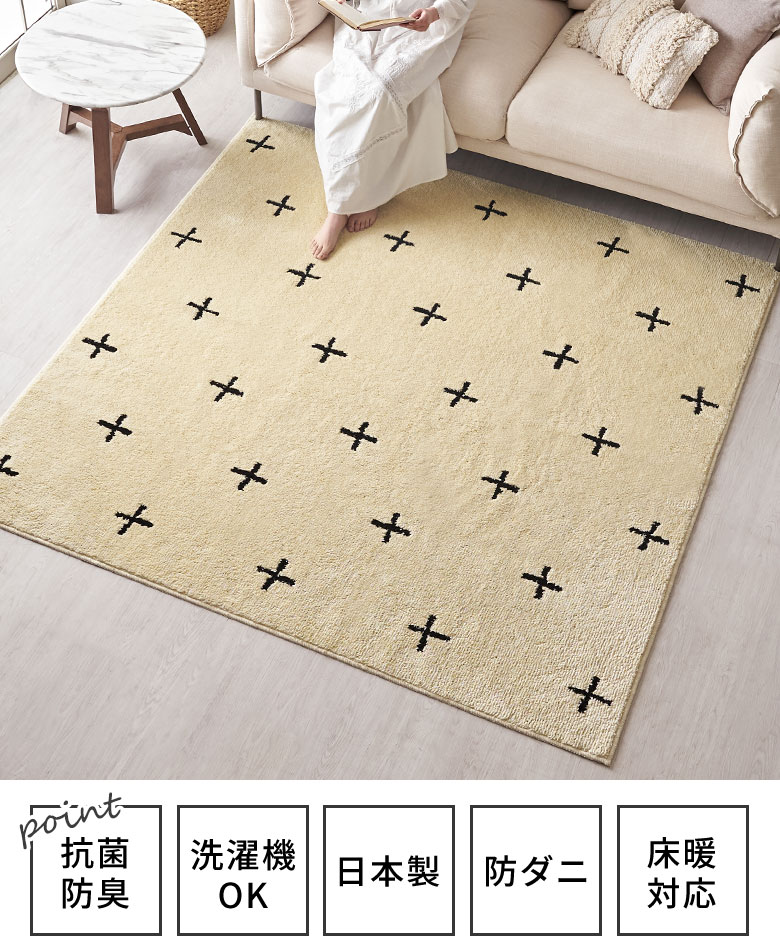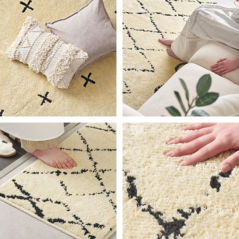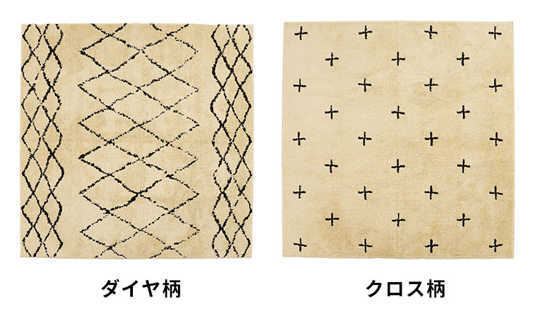 これだけの機能性を持ちながら、しかもおしゃれ!フリーハンドで描かれたような模様で、ベニオワレンラグ風ダイヤ柄とクロス柄の2パターンからお選びいただけます。ベーシックカラーでインテリアに馴染みやすいので、デザインラグ初心者の方にもおすすめです。
