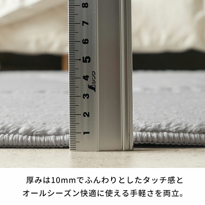 軽量だから持ち運びがしやすく、模様替えや掃除の際も扱いやすいのが魅力。4サイズ展開で、リビング、ダイニング、寝室など様々なシーンにフィットします。デザインラグに挑戦したい方や、毛足の短いラグでは物足りないと感じている方にもおすすめのアイテムです。