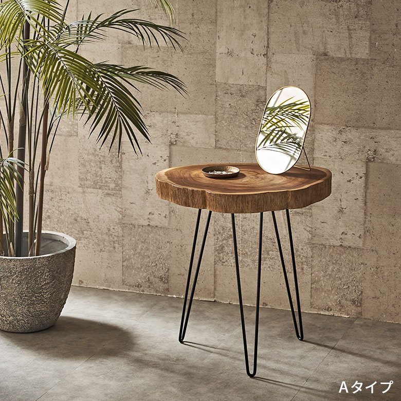 天板のユニークさを最大限に生かしたデザイン。スタイリッシュなブラックアイアンレッグを合わせて、ミニマルに仕上げました。天然木なので、様々なインテリアスタイルとマッチします。