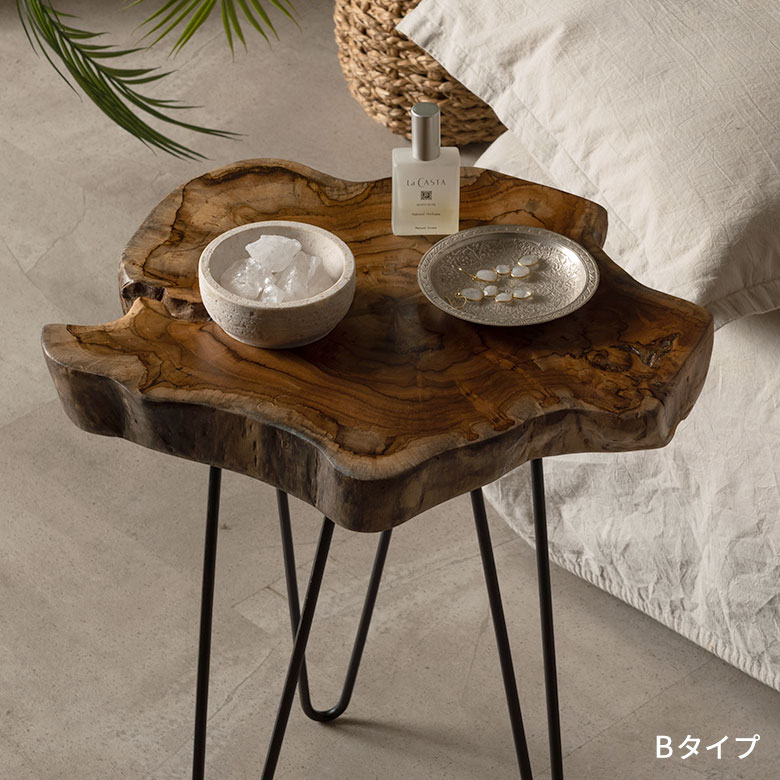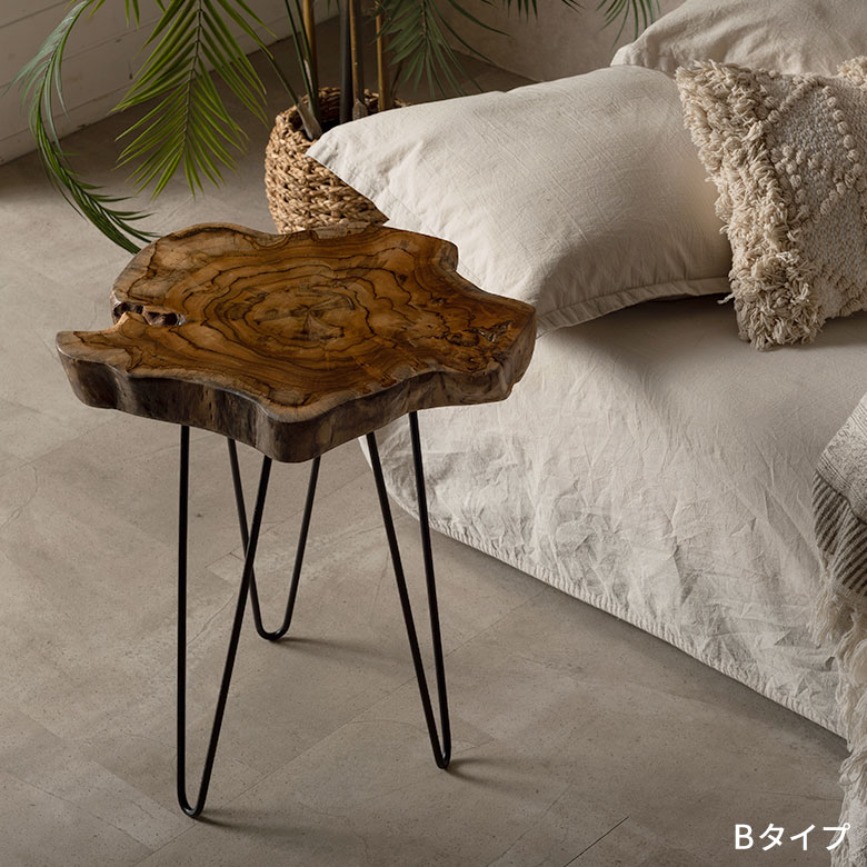 無垢のチークウッドをそのまま活かした、自然の造形美が際立つ切り株サイドテーブル。木が育つ過程で生まれたラインや表情をそのまま天板に残し、自然が造り出した遊び心をお部屋に取り入れられるアイテムです。