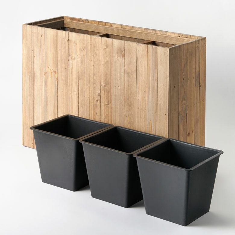 こちらのプランターカバーは、アップサイクルのパインウッド材を使いました。