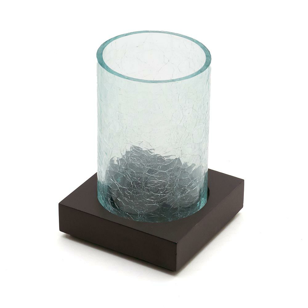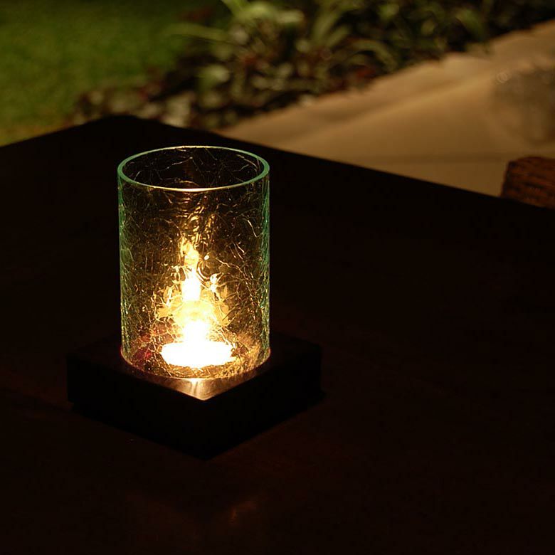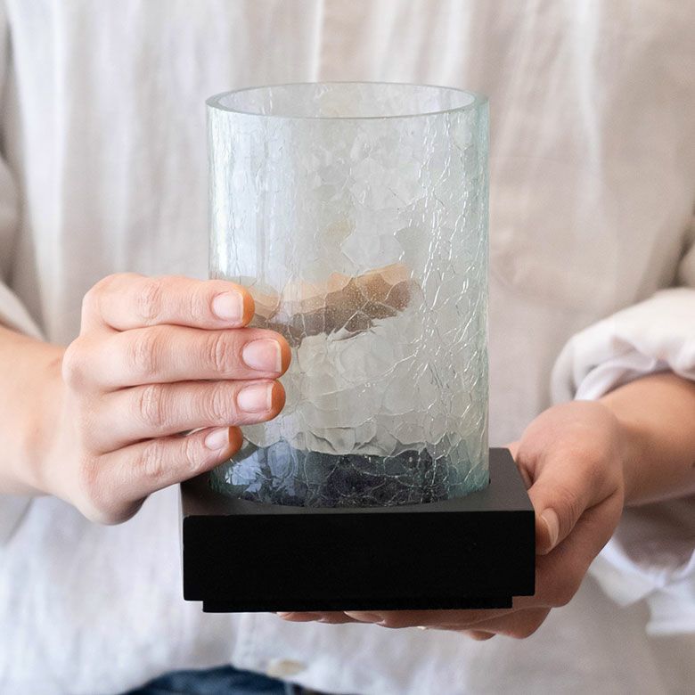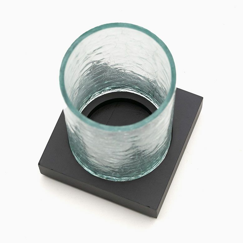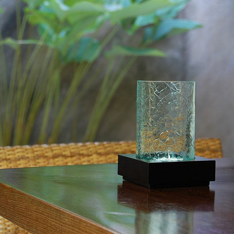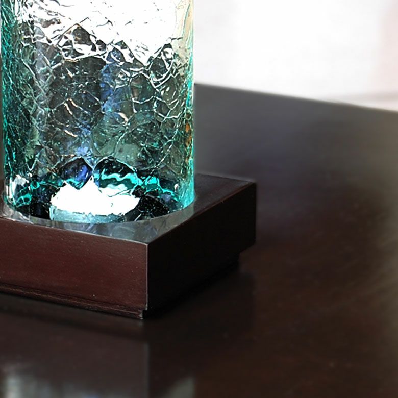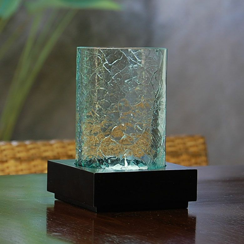 筒状のガラスシェードを木製の台にはめこむタイプ。