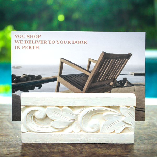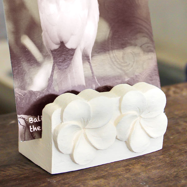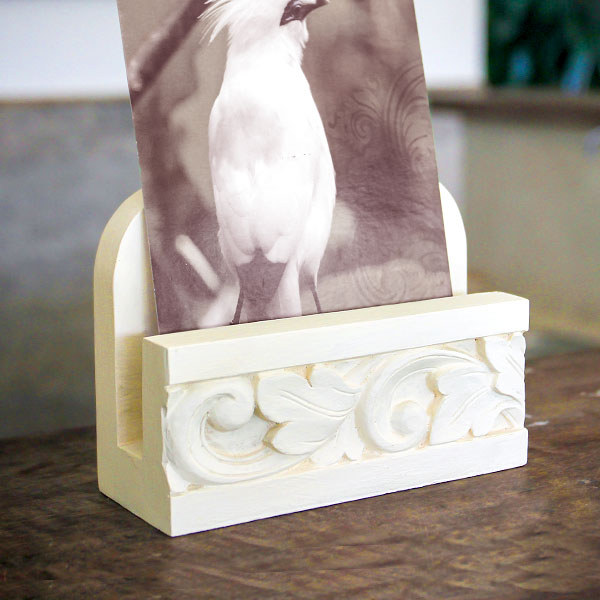 バリ島らしいアラベスクデザインがかたどられたカードスタンド。幅約12cmの大きめサイズなので名刺サイズのカードはもちろん、写真やポストカードも飾れます。フライヤーやショップカードスタンドに、店舗でのご使用もおすすめです。