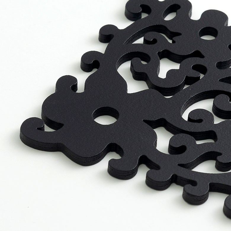 切り絵や彫刻アートのような、美しい木製コースター。