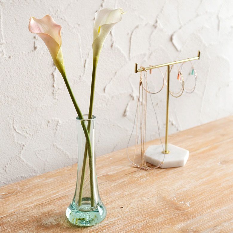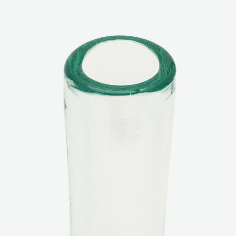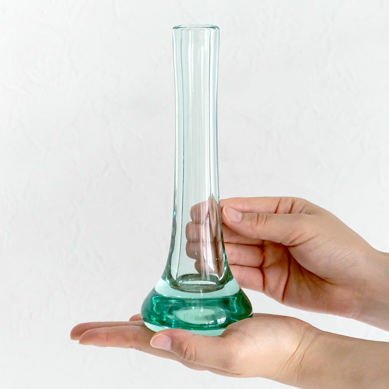 すっと伸びた細い口に、涼しげな色合いが特徴のフラワーベース。