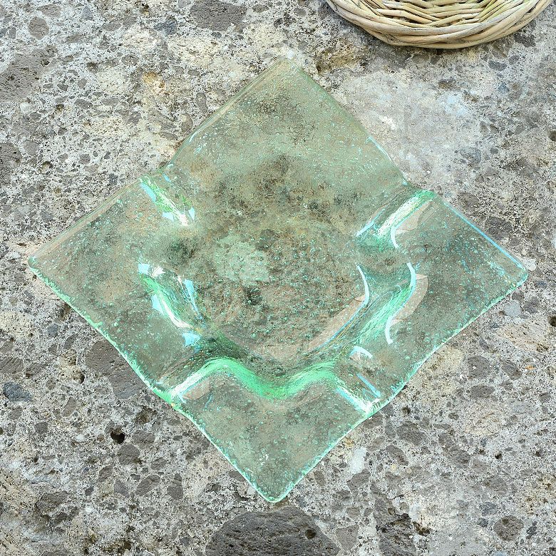 小さな気泡が入った、ラムネボトルを思わせるブルーグリーンのガラス。