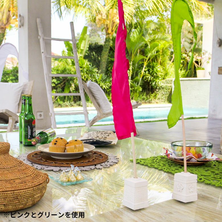 玄関やエントランスに飾るのはもちろん、テーブルに置くのも◎。バリ島のあのリゾート感溢れる雰囲気をおうちで是非再現してみてください♪風になびくカラフルな旗は人目を引くので、ショップのディスプレイとしてもおすすめ。