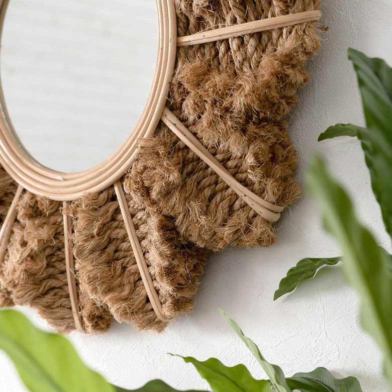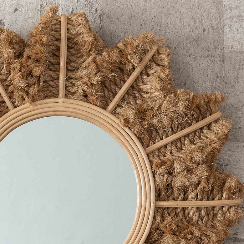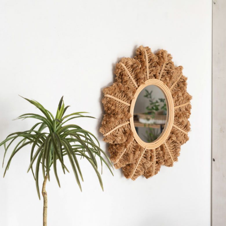 太陽や花を連想させる、ラタンと麻でできたウォールミラー。