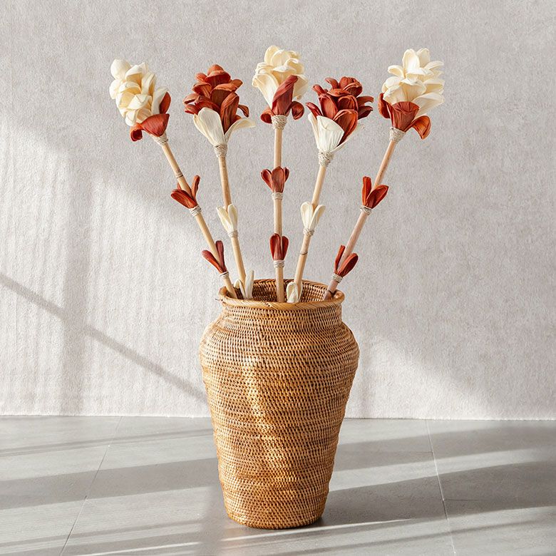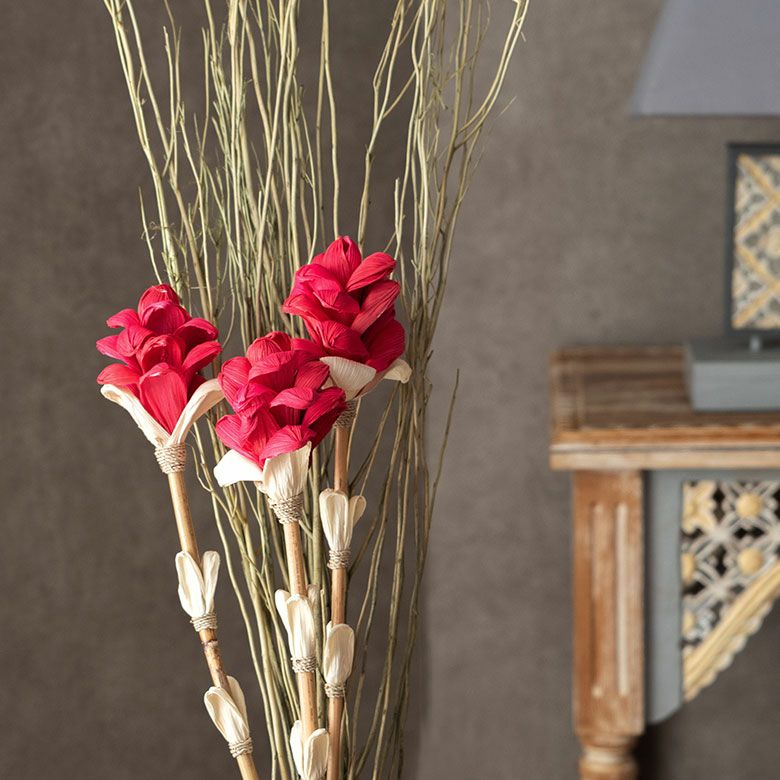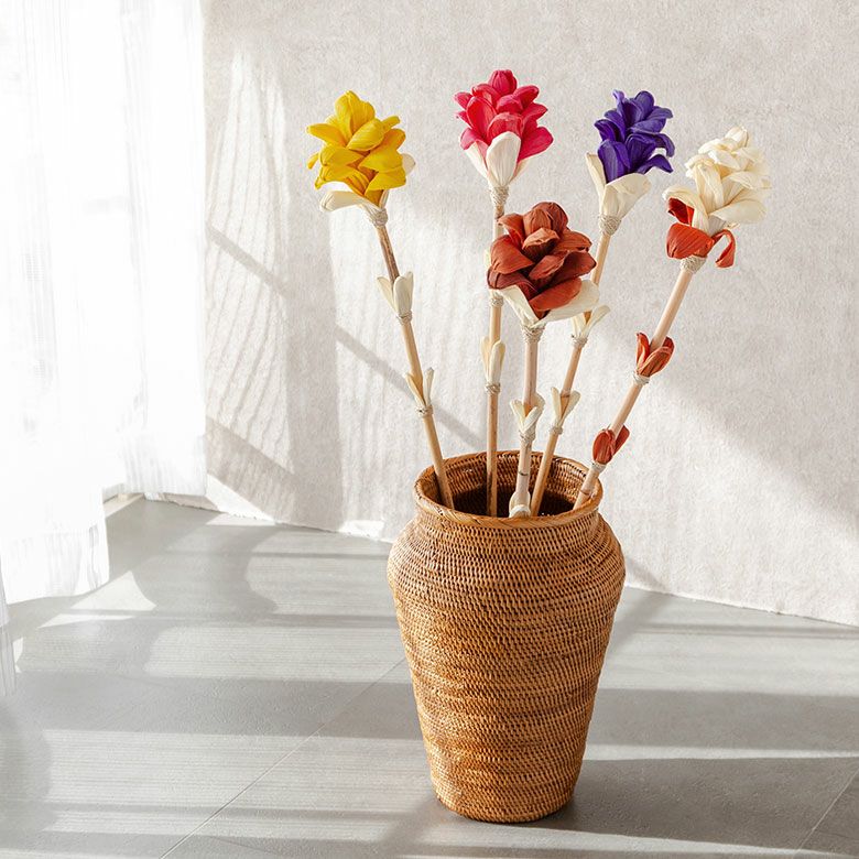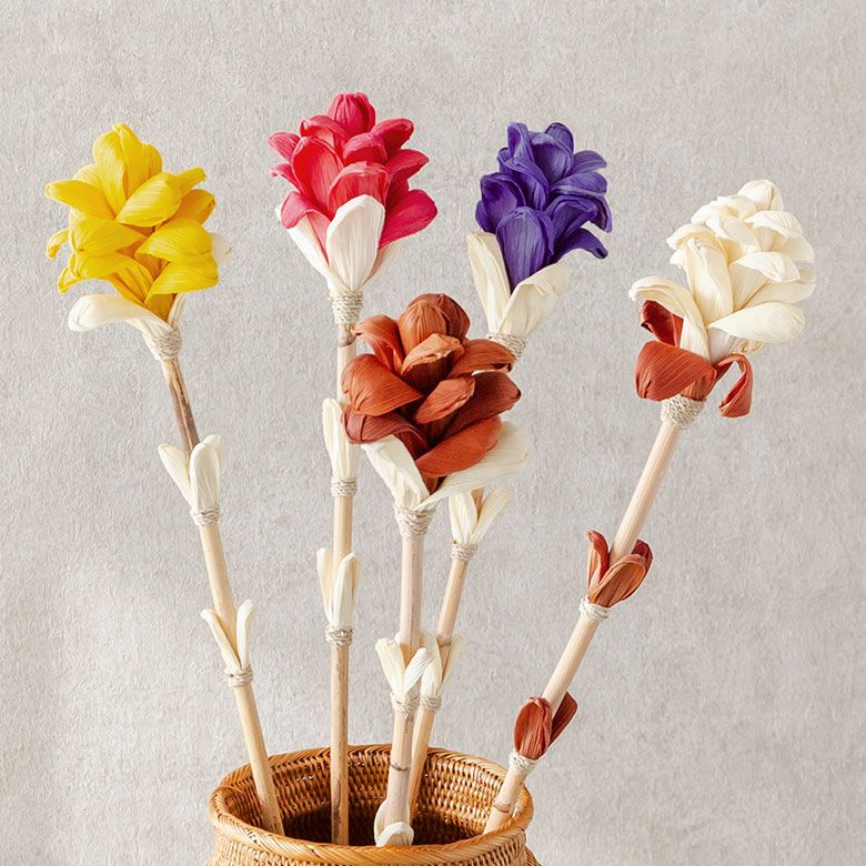 バリ島の職人によるハンドメイドのつぼみの存在感があるアートプランツ。 つぼみはコーンリーフ(とうもろこしの葉)、軸は竹でできているので、天然素材の温もりを感じられるオブジェです。 リビングやエントランスなどに飾ると、アジアンな雰囲気を演出。 お気に入りの花瓶やバスケットと一緒に飾ってみて。 5色展開なので、好きな色を組み合わせて楽しめます。