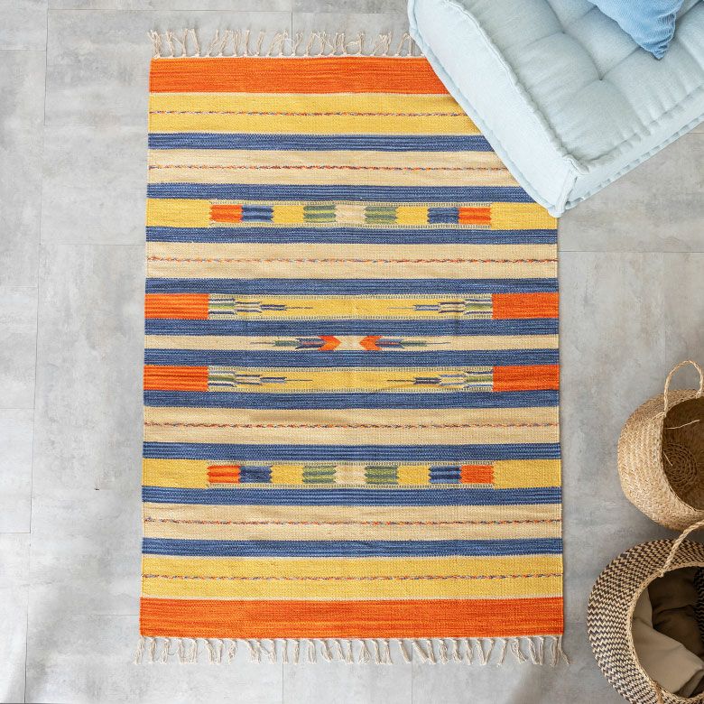 サイドのフリンジや、目を惹く色味がお部屋のアクセントになるキリムラグ。