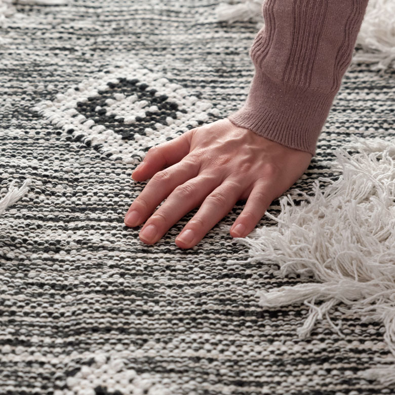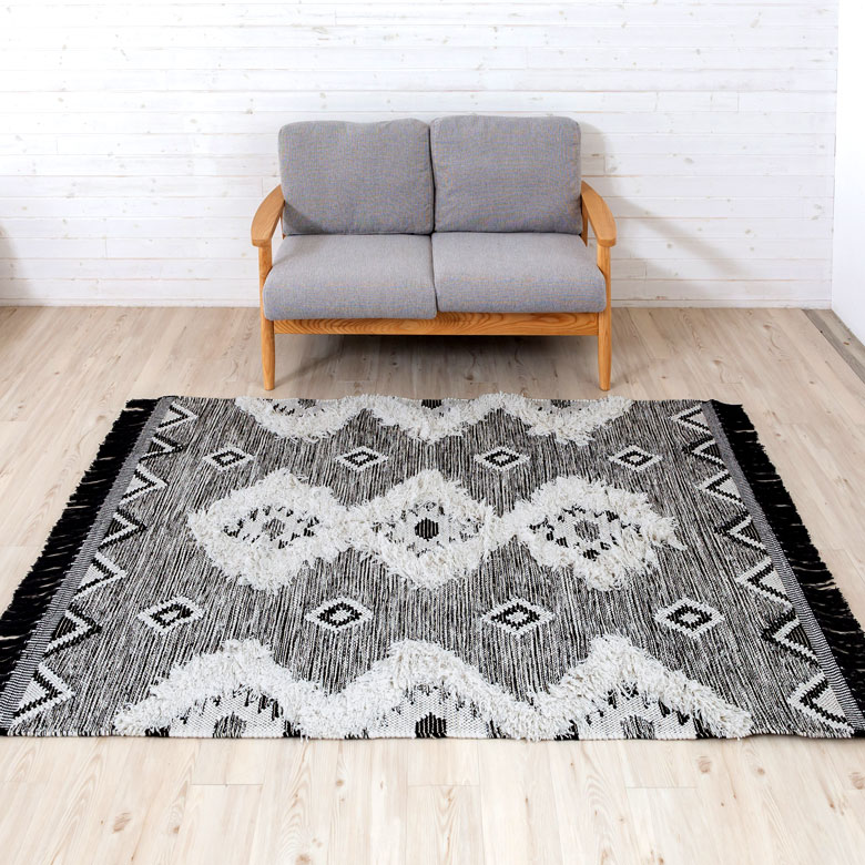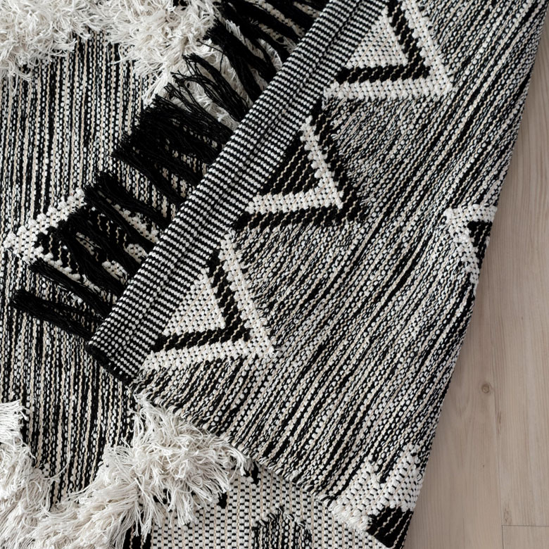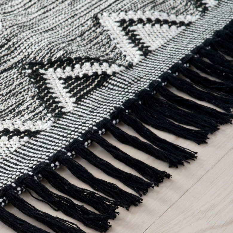 白黒のフリンジが印象的なエスニック柄のラグ。