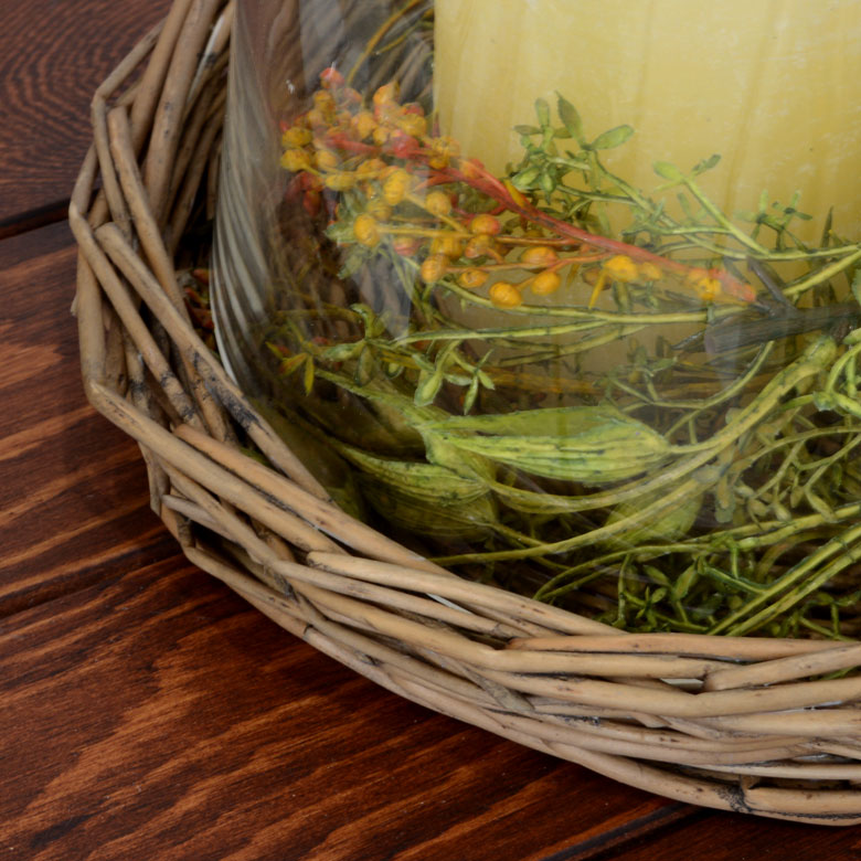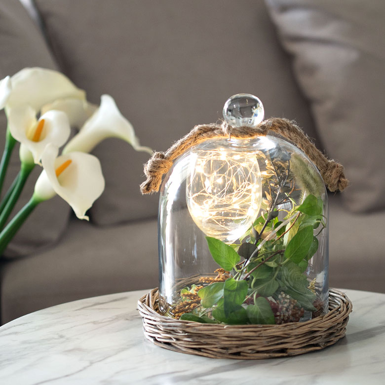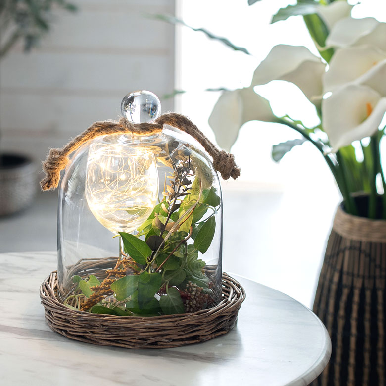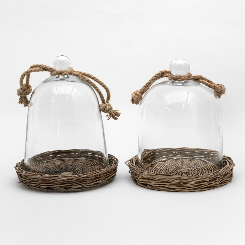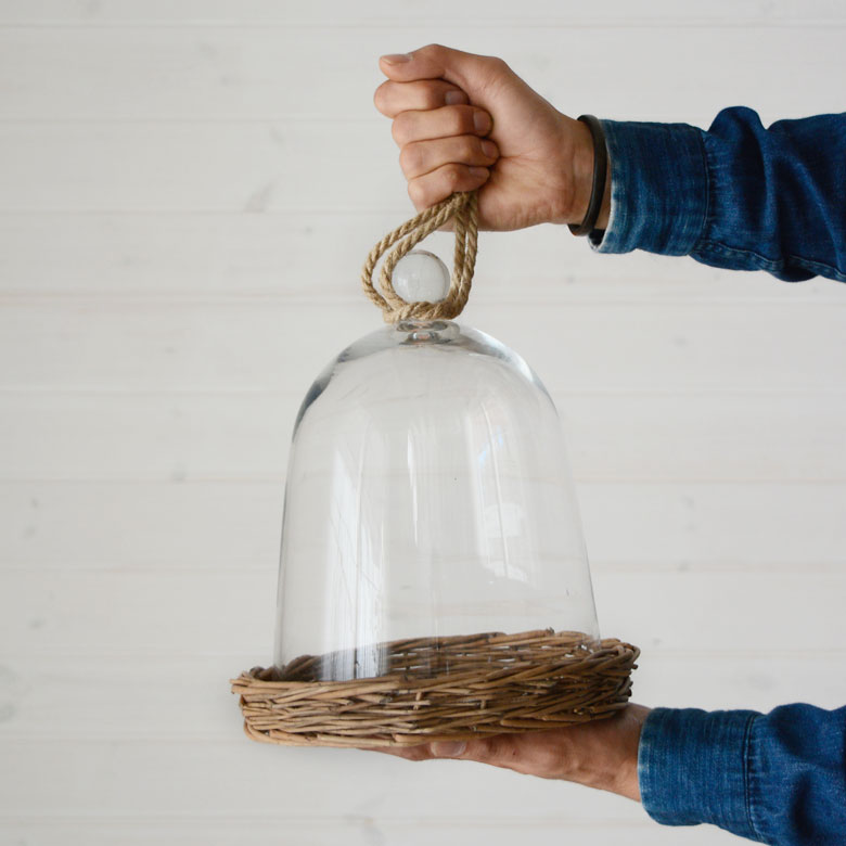 ざっくりとした柳のバスケットトレイにドームガラスを合わせた、ガラスのインテリアケース。