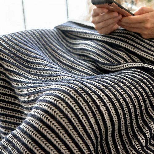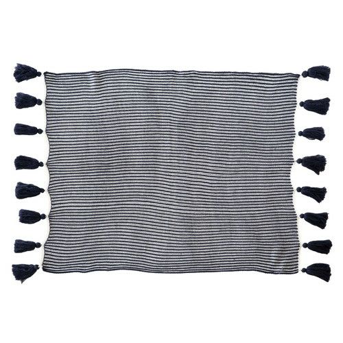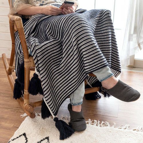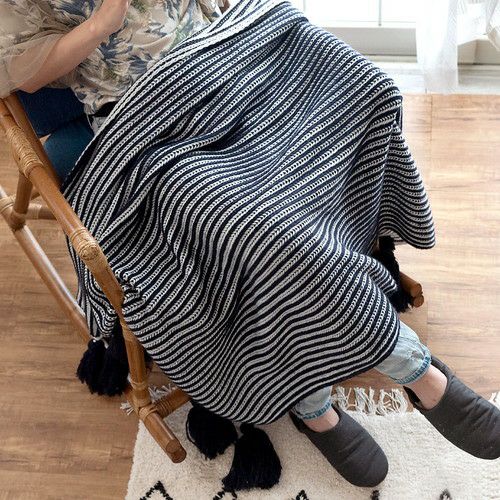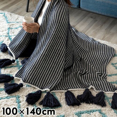 大ぶりのタッセルを大胆にあしらったボーダー柄のブランケット。