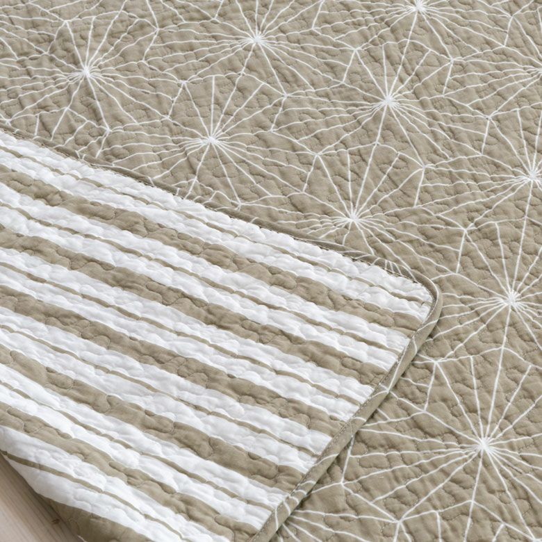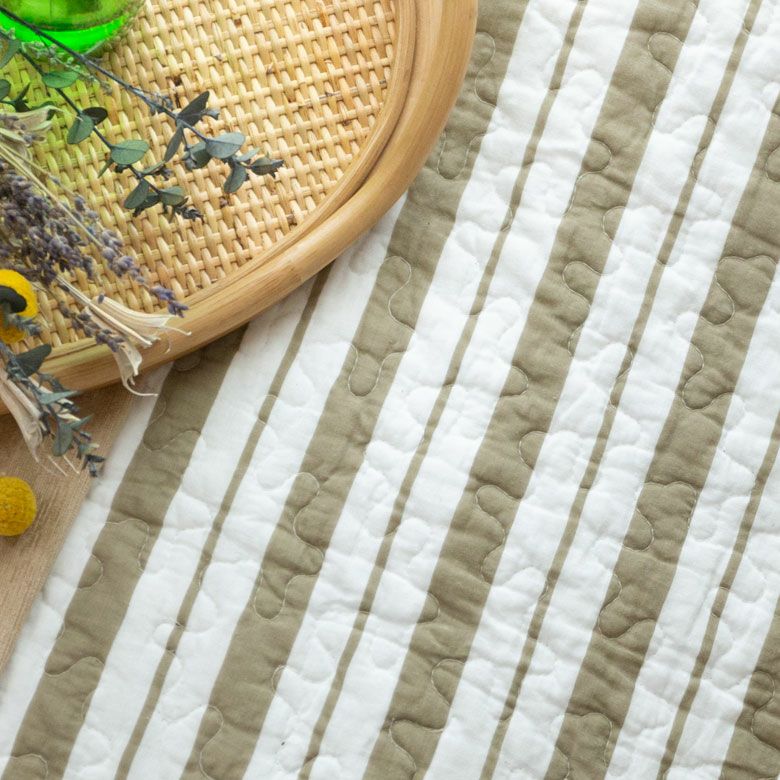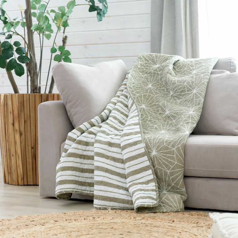 甘すぎない幾何学模様、ストライプ柄のリバーシブルタイプのマルチカバー。