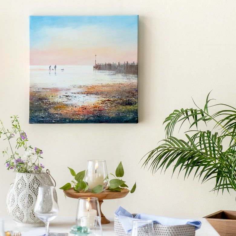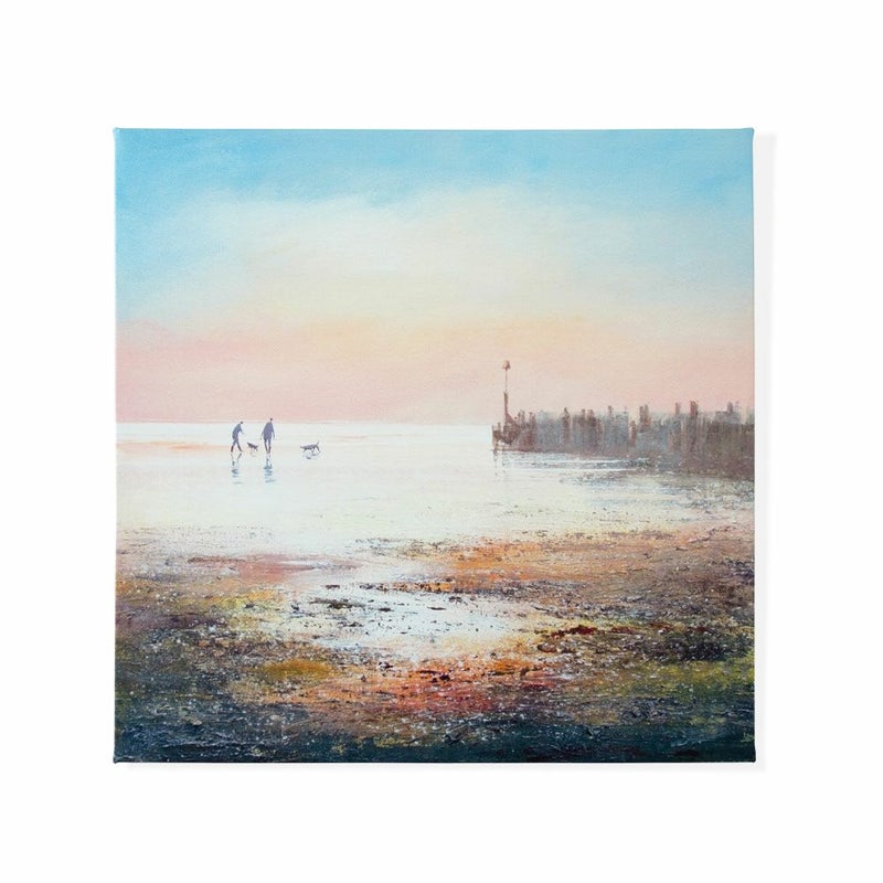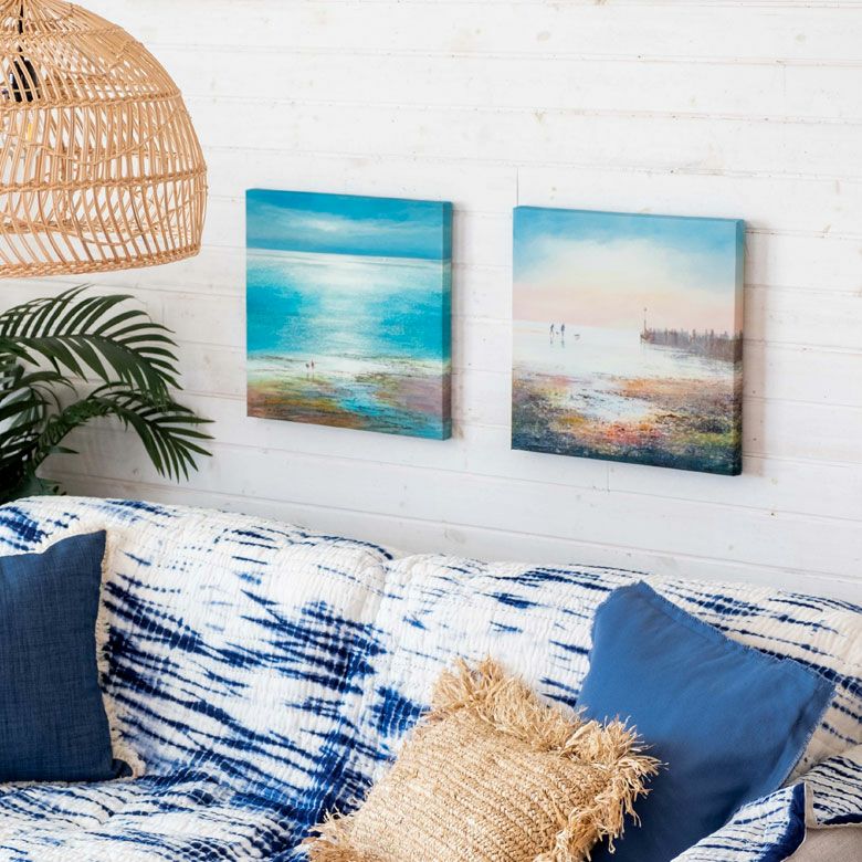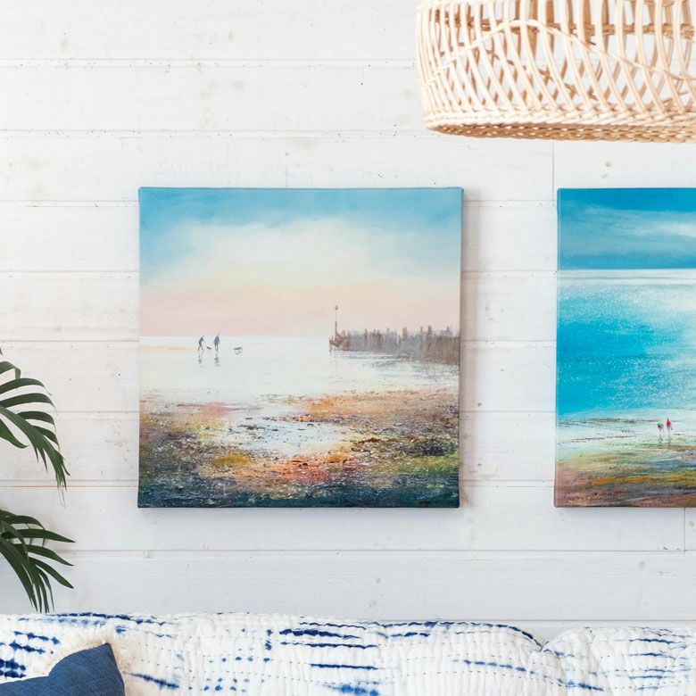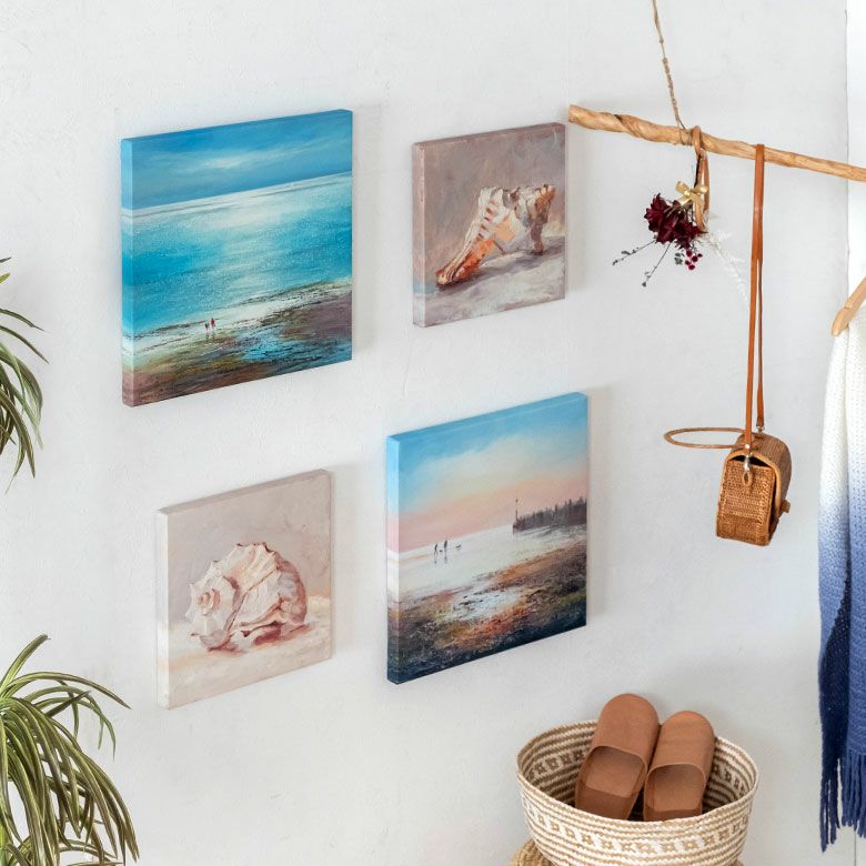 穏やかな海岸を柔らかいタッチで描いた、温かみのあるアート。