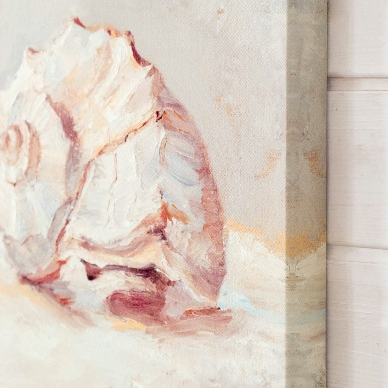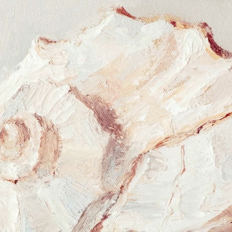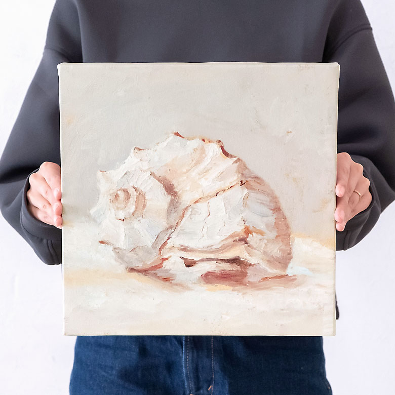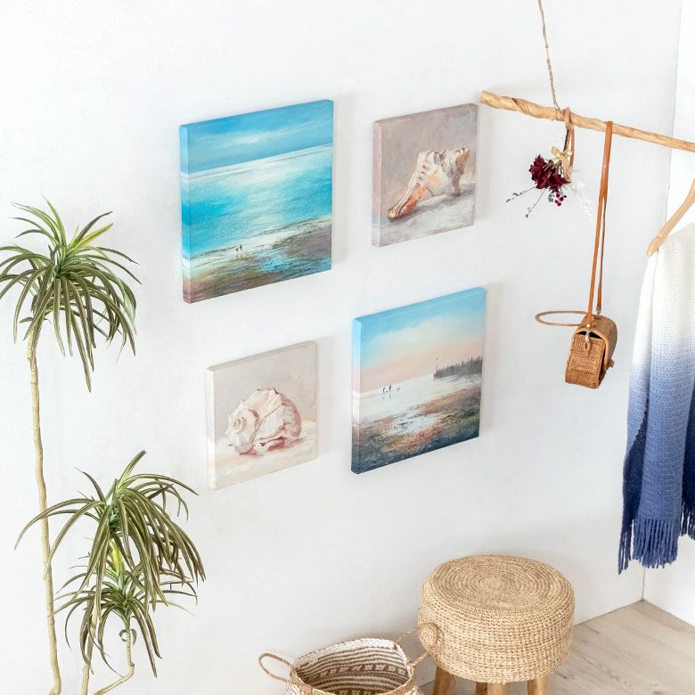 柔らかいタッチで描かれた貝殻が、暖かな海を感じさせるアート。