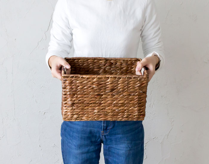 レザー(合皮)の持ち手付きなので移動もさせやすく、シェルフの引き出しに使うのにも便利!