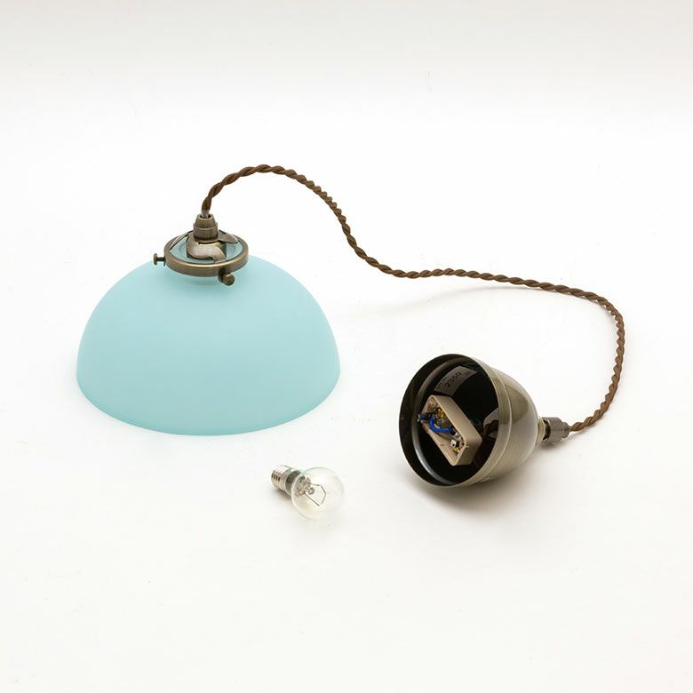 淡いブルーのガラスに青銅色の金具がお洒落なライトです。