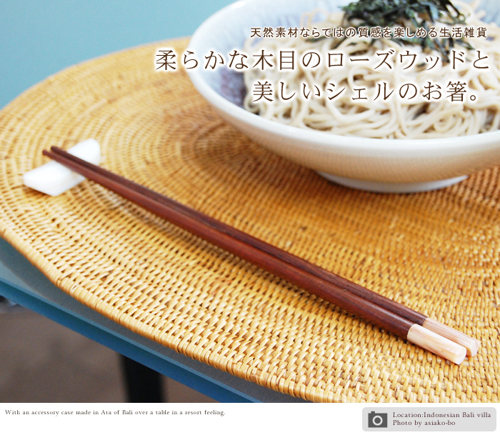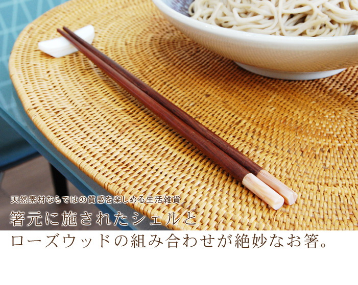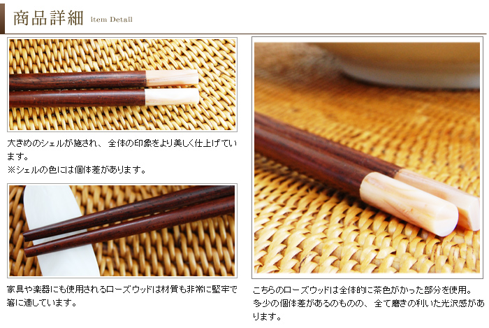 箸元に施されたシェルは柔らかい色味なのでローズウッドとも相性がよく